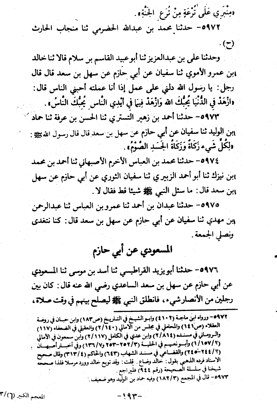 5972 - حَدَّثَنَا مُحَمَّدُ بْنُ عَبْدِ اللهِ الْحَضْرَمِيُّ، ثنا مِنْجَابٌ الْحَارِثُ، ح وَحَدَّثَنَا عَلِيُّ بْنُ عَبْدِ الْعَزِيزِ، ثنا أَبُو عُبَيْدٍ الْقَاسِمُ بْنُ سَلَّامٍ قَالَا: ثنا خَالِدُ بْنُ عَمْرٍو الْأُمَوِيُّ، ثنا سُفْيَانُ، عَنْ أَبِي حَازِمٍ، عَنْ سَهْلِ بْنِ سَعْدٍ قَالَ: قَالَ رَجُلٌ: يَا رَسُولَ اللهِ، دُلَّنِي عَلَى عَمِلٍ إِذَا أَنَا عَمِلْتُهُ أَحَبَّنِي النَّاسُ، قَالَ: «§ازْهَدْ فِي الدُّنْيَا يُحِبَّكَ اللهُ، وَازْهَدْ فِيمَا فِي أَيْدِي النَّاسِ يُحِبَّكَ النَّاسُ»