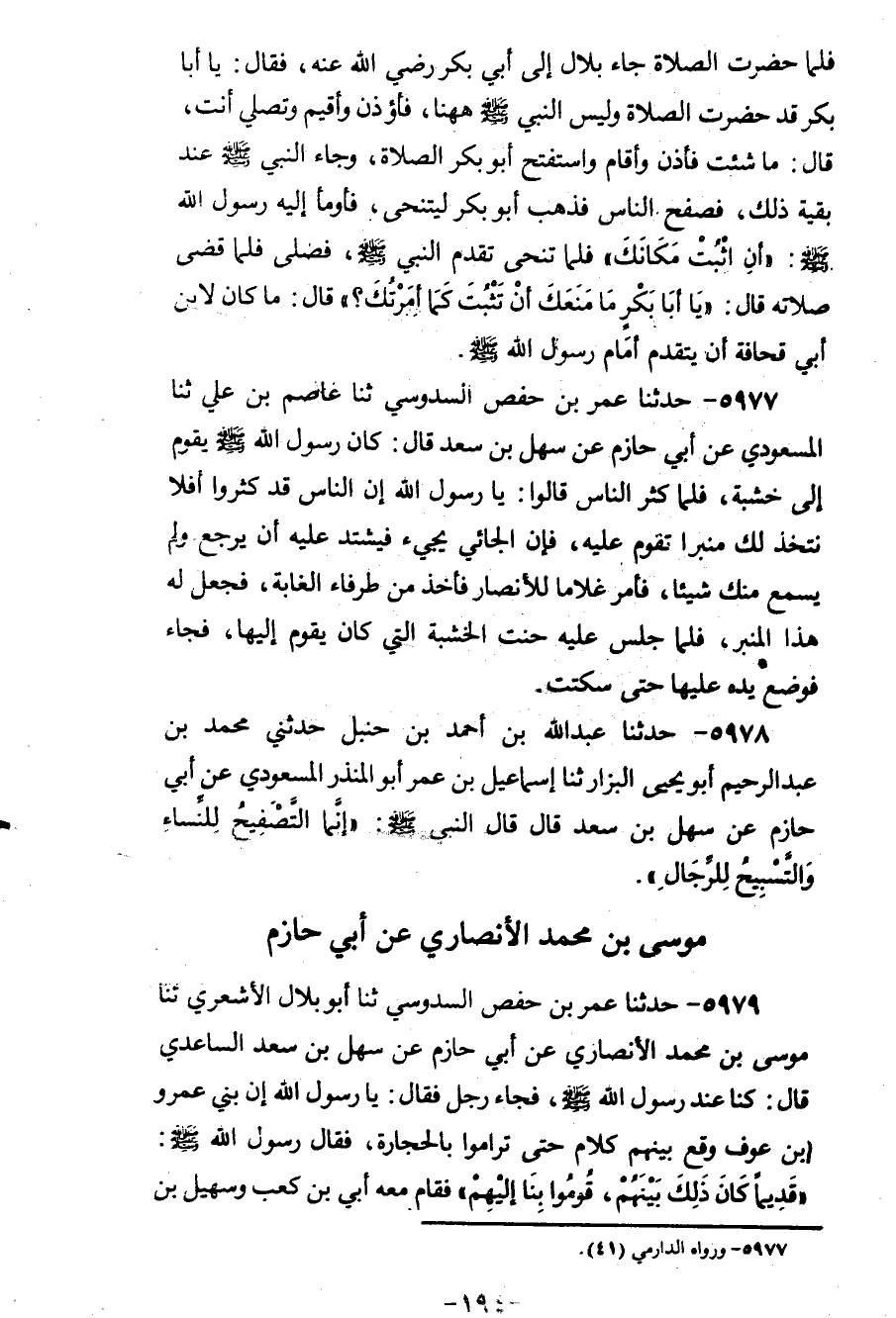 5979 - حَدَّثَنَا عُمَرُ بْنُ حَفْصٍ السَّدُوسِيُّ، ثنا أَبُو بِلَالٍ الْأَشْعَرِيُّ، ثنا مُوسَى بْنُ مُحَمَّدٍ الْأَنْصَارِيُّ، عَنْ أَبِي حَازِمٍ، عَنْ سَهْلِ بْنِ سَعْدٍ السَّاعِدِيِّ قَالَ: كُنَّا عِنْدَ رَسُولِ اللهِ صَلَّى اللهُ عَلَيْهِ وَسَلَّمَ، فَجَاءَ رَجُلٌ فَقَالَ: يَا رَسُولَ اللهِ، إِنَّ بَنِي عَمْرِو بْنِ عَوْفٍ وَقَعَ بَيْنَهُمْ كَلَامٌ حَتَّى تَرَامَوْا بِالْحِجَارَةِ، فَقَالَ رَسُولُ اللهِ صَلَّى اللهُ عَلَيْهِ وَسَلَّمَ: «قَدِيمًا كَانَ ذَلِكَ بَيْنَهُمْ، قُومُوا بِنَا إِلَيْهِمْ» ، فَقَامَ مَعَهُ أُبَيُّ بْنُ كَعْبٍ، وَسُهَيْلُ بْنُ بَيْضَاءَ فَأَصْلَحَ بَيْنَهُمْ وَحَضَرَتِ الصَّلَاةُ، فَأَذَّنَ بِلَالٌ، فَرَاثَ عَلَيْهِمْ رَسُولُ اللهِ صَلَّى اللهُ عَلَيْهِ وَسَلَّمَ - يَعْنِي أَبْطَأَ -، فَقَالَ النَّاسُ لِأَبِي بَكْرٍ: تَقَدَّمْ، فَقَالَ: تَرَوْنَ ذَلِكَ؟ قَالُوا: نَعَمْ، فَتَقَدَّمَ وَأَقْبَلَ رَسُولُ اللهِ صَلَّى اللهُ عَلَيْهِ وَسَلَّمَ، فَجَعَلَ النَّاسُ يُصَفِّحُونَ، وَكَانَ أَبُو بَكْرٍ رَضِيَ اللهُ عَنْهُ لَا يَلْتَفِتُ فِي الصَّلَاةِ، فَلَمَّا سَمِعَهُمْ يُصَفِّحُونَ الْتَفَتَ، فَرَأَى رَسُولَ اللهِ صَلَّى اللهُ عَلَيْهِ وَسَلَّمَ، فَنَكَصَ عَلَى عَقِبَيْهِ، فَأَوْمَأَ إِلَيْهِ أَنْ مَكَانَكَ، فَتَأَخَّرَ، وَتَقَدَّمَ رَسُولُ اللهِ صَلَّى اللهُ عَلَيْهِ وَسَلَّمَ، فَصَلَّى بِالنَّاسِ، فَلَمَّا انْصَرَفَ، قَالَ: «يَا أَبَا بَكْرٍ، مَا مَنَعَكَ أَنْ تَثْبُتَ فِي مَكَانِكَ حِينَ أَوْمَأْتُ إِلَيْكَ؟» ، قَالَ: مَا كَانَ لِابْنِ أَبِي قُحَافَةَ أَنْ يَتَقَدَّمَ أَمَامَ رَسُولِ اللهِ صَلَّى اللهُ عَلَيْهِ وَسَلَّمَ، ثُمَّ قَالَ رَسُولُ اللهِ صَلَّى اللهُ عَلَيْهِ وَسَلَّمَ: «§مَا لِي أَرَاكُمْ صَفَّحْتُمْ؟ مَنْ نَابَهُ فِي صَلَاتِهِ شَيْءٌ، فَإِنَّ التَّسْبِيحَ لِلرِّجَالِ، وَالتَّصْفِيقَ لِلنِّسَاءِ»