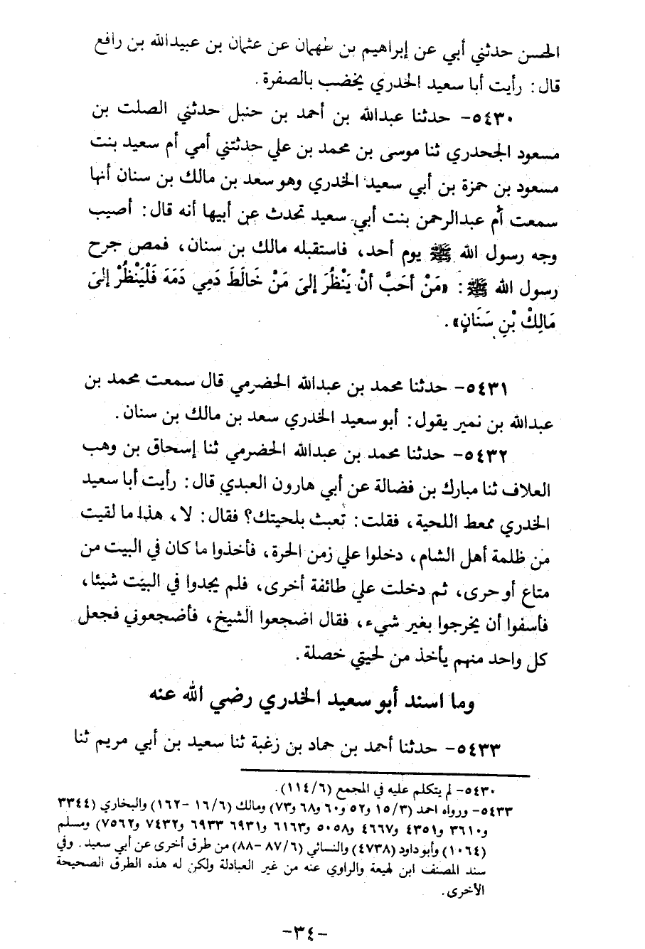 5430 - حَدَّثَنَا عَبْدُ اللهِ بْنُ أَحْمَدَ بْنِ حَنْبَلٍ، حَدَّثَنِي الصَّلْتُ بْنُ مَسْعُودٍ الْجَحْدَرِيُّ، ثنا مُوسَى بْنُ مُحَمَّدِ بْنِ عَلِيٍّ، حَدَّثَتْنِي أُمِّي أُمُّ سَعِيدٍ بِنْتُ مَسْعُودِ بْنِ حَمْزَةَ بْنِ أَبِي سَعِيدٍ الْخُدْرِيِّ، وَهُوَ سَعْدُ بْنُ مَالِكِ بْنِ سِنَانٍ، أَنَّهَا: سَمِعَتْ أُمَّ عَبْدِ الرَّحْمَنِ بِنْتَ أَبِي سَعِيدٍ تُحَدِّثُ، عَنْ أَبِيهَا، أَنَّهُ قَالَ: أُصِيبَ وَجْهُ رَسُولِ اللهِ صَلَّى اللهُ عَلَيْهِ وَسَلَّمَ يَوْمَ أُحُدٍ، فَاسْتَقْبَلَهُ مَالِكُ بْنُ سِنَانٍ فَمَصَّ جُرْحَ رَسُولِ اللهِ صَلَّى اللهُ عَلَيْهِ وَسَلَّمَ: «§مَنْ أَحَبَّ أَنْ يَنْظُرَ إِلَى مَنْ خَالَطَ دَمِي دَمَهُ فَلْيَنْظُرْ إِلَى مَالِكِ بْنِ سِنَانٍ»