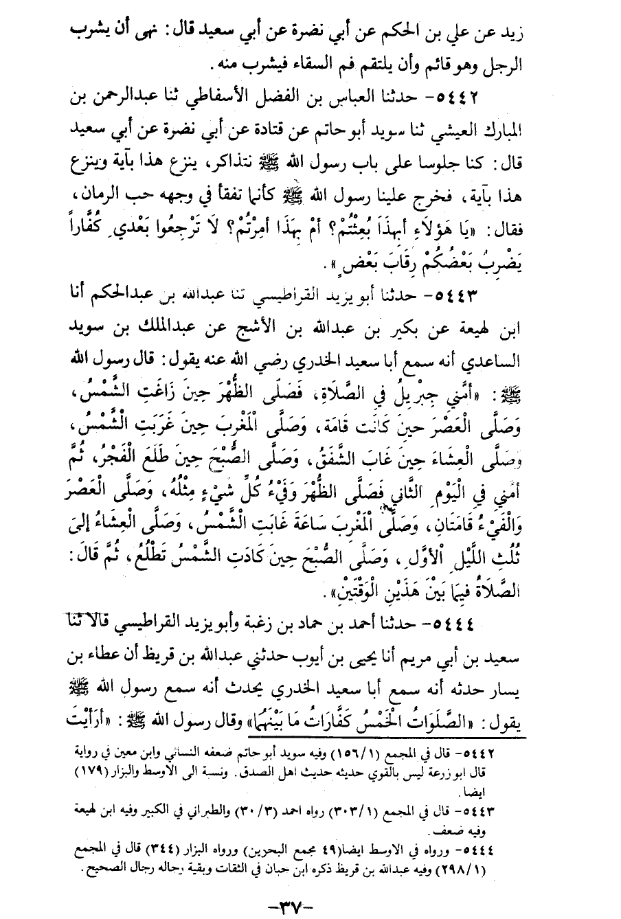5444 - حَدَّثَنَا أَحْمَدُ بْنُ حَمَّادِ بْنِ زُغْبَةَ، وَأَبُو يَزِيدَ الْقَرَاطِيسِيُّ قَالَا: ثنا سَعِيدُ بْنُ أَبِي مَرْيَمَ، أَنَا يَحْيَى بْنُ أَيُّوبَ، حَدَّثَنِي عَبْدُ اللهِ بْنُ قُرَيْظٍ، أَنَّ عَطَاءَ بْنَ يَسَارٍ حَدَّثَهُ أَنَّهُ: سَمِعَ أَبَا سَعِيدٍ الْخُدْرِيَّ يُحَدِّثُ أَنَّهُ: سَمِعَ رَسُولَ اللهِ صَلَّى اللهُ عَلَيْهِ وَسَلَّمَ يَقُولُ: «§الصَّلَوَاتُ الْخَمْسُ كَفَّارَاتُ مَا بَيْنَهُمَا»