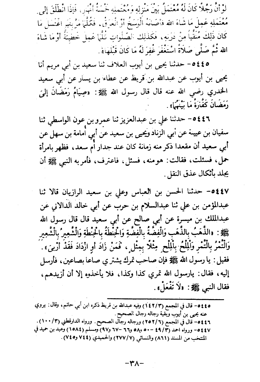5447 - حَدَّثَنَا الْحَسَنُ بْنُ الْعَبَّاسِ، وَعَلِيُّ بْنُ سَعِيدٍ الرَّازِيَّانِ قَالَا: ثنا عَبْدُ الْمُؤْمِنِ بْنُ عَلِيٍّ، ثنا عَبْدُ السَّلَامِ بْنُ حَرْبٍ، عَنْ أَبِي خَالِدٍ الدَّالَانِيِّ، عَنْ عَبْدِ الْمَلِكِ بْنِ مَيْسَرَةَ، عَنْ أَبِي صَالِحٍ، عَنْ أَبِي سَعِيدٍ قَالَ: قَالَ رَسُولُ اللهِ صَلَّى اللهُ عَلَيْهِ وَسَلَّمَ: «§الذَّهَبُ بِالذَّهَبِ، وَالْفِضَّةُ بِالْفِضَّةِ، وَالْحِنْطَةُ بِالْحِنْطَةِ، وَالشَّعِيرُ بِالشَّعِيرِ، وَالتَّمْرُ بِالتَّمْرِ، وَالْمِلْحُ بِالْمِلْحِ، مِثْلًا بِمِثْلٍ، فَمَنْ زَادَ أَوِ ازْدَادَ فَقَدْ أَرْبَى» ، فَقِيلَ: يَا رَسُولَ اللهِ، صَلَّى اللهُ عَلَيْهِ وَسَلَّمَ، فَإِنَّ صَاحِبَ تَمْرِكَ يَشْتَرِي صَاعًا بِصَاعَيْنِ، فَأَرْسَلَ إِلَيْهِ فَقَالَ: يَا رَسُولَ اللهِ، تَمْرِي كَذَا وَكَذَا، فَلَا يَأْخُذُوهُ إِلَّا أَنْ أَزِيدَهُمْ، فَقَالَ النَّبِيُّ صَلَّى اللهُ عَلَيْهِ وَسَلَّمَ: «لَا تَفْعَلْ»