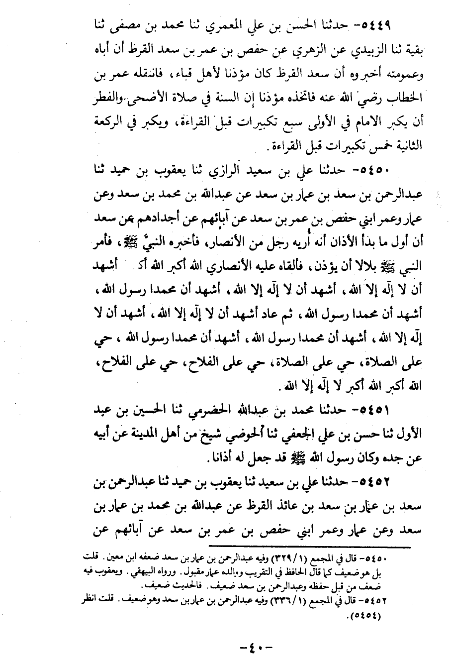 5450 - حَدَّثَنَا عَلِيُّ بْنُ سَعِيدٍ الرَّازِيُّ، ثنا يَعْقُوبُ بْنُ حُمَيْدٍ، ثنا عَبْدُ الرَّحْمَنِ بْنُ سَعْدِ بْنِ عَمَّارِ بْنِ سَعْدٍ، عَنْ عَبْدِ اللهِ بْنِ مُحَمَّدِ بْنِ سَعْدٍ، وَعَنْ عَمَّارٍ، وَعُمَرَ ابْنَيْ حَفْصِ بْنِ عُمَرَ بْنِ سَعْدٍ، عَنْ آبَائِهِمْ، عَنْ أجْدَادِهِمْ، عَنْ سَعْدٍ، «أَنَّ أَوَّلَ مَا بَدَأَ الْأَذَانُ أَنَّهُ أُرِيَهُ رَجُلٌ مِنَ الْأَنْصَارِ، فَأَخْبَرَهُ النَّبِيَّ صَلَّى اللهُ عَلَيْهِ وَسَلَّمَ، §فَأَمَرَ النَّبِيُّ صَلَّى اللهُ عَلَيْهِ وَسَلَّمَ بِلَالًا أَنْ يُؤَذِّنَ» ، فَأَلْقَاهُ عَلَيْهِ الْأَنْصَارِيُّ: اللهُ أَكْبَرُ اللهُ أَكْبَرُ، أَشْهَدُ أَنْ لَا إِلَهَ إِلَّا اللهُ، أَشْهَدُ أَنْ لَا إِلَهَ إِلَّا اللهُ، أَشْهَدُ أَنَّ مُحَمَّدًا رَسُولُ اللهِ، أَشْهَدُ أَنَّ مُحَمَّدًا رَسُولُ اللهِ، ثُمَّ عَادَ: أَشْهَدُ أَنْ لَا إِلَهَ إِلَّا اللهُ، أَشْهَدُ أَنْ لَا إِلَهَ إِلَّا اللهُ، أَشْهَدُ أَنَّ مُحَمَّدًا رَسُولُ اللهِ، أَشْهَدُ أَنَّ مُحَمَّدًا رَسُولُ اللهِ، حَيَّ عَلَى الصَّلَاةِ حَيَّ عَلَى الصَّلَاةِ، حَيَّ عَلَى الْفَلَاحِ حَيَّ عَلَى الْفَلَاحِ، اللهُ أَكْبَرُ اللهُ أَكْبَرُ، لَا إِلَهَ إِلَّا اللهُ
