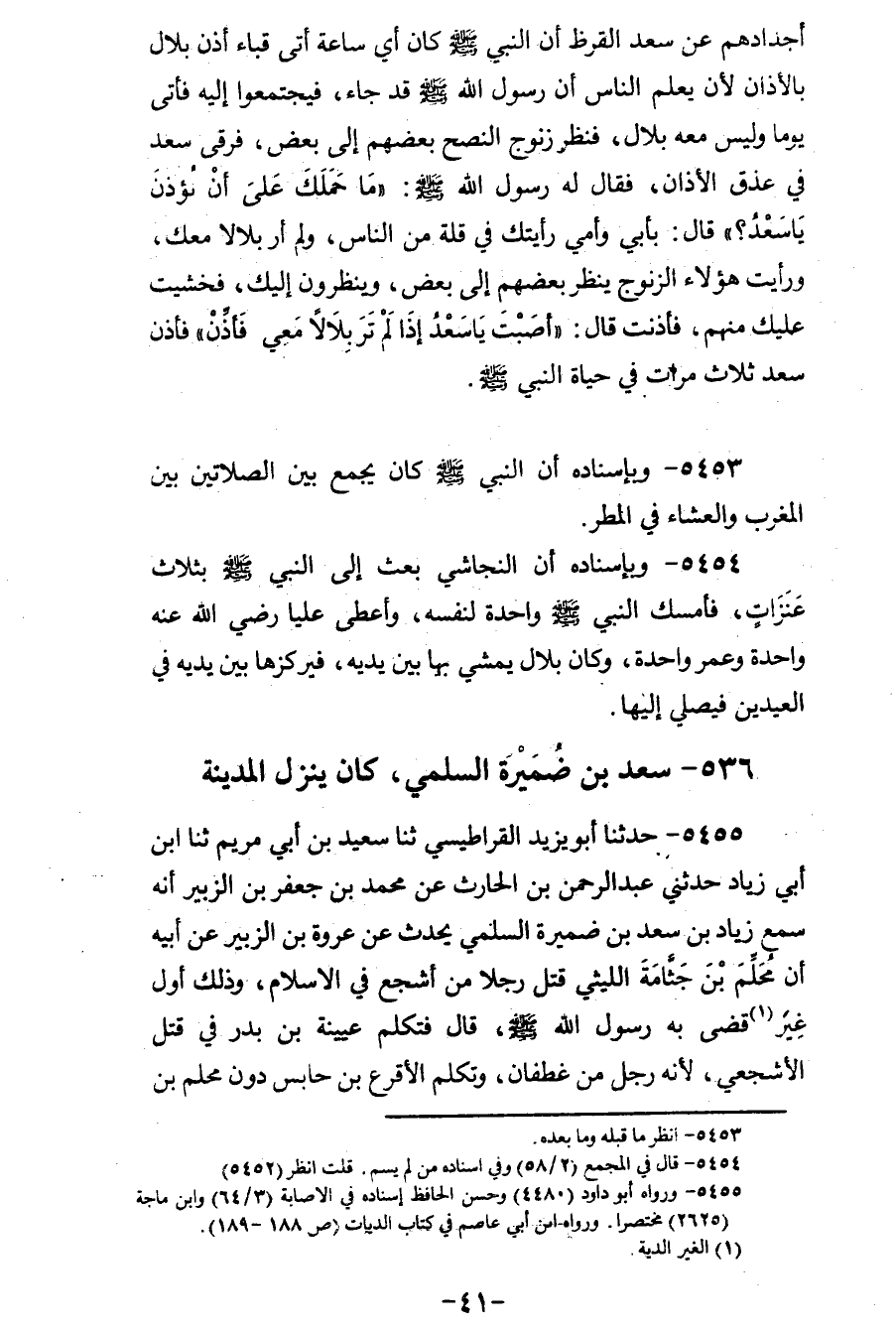 5455 - حَدَّثَنَا أَبُو يَزِيدَ الْقَرَاطِيسِيُّ، ثنا سَعِيدُ بْنُ أَبِي مَرْيَمَ، ثنا ابْنُ أَبِي زِيَادٍ، حَدَّثَنِي عَبْدُ الرَّحْمَنِ بْنُ الْحَارِثِ، عَنْ مُحَمَّدِ بْنِ جَعْفَرِ بْنِ الزُّبَيْرِ أَنَّهُ: سَمِعَ زِيَادَ بْنَ سَعْدِ بْنِ ضُمَيْرَةَ السُّلَمِيَّ يُحَدِّثُ، عَنْ عُرْوَةَ بْنِ الزُّبَيْرِ، عَنْ أَبِيهِ، أَنَّ مُحَلِّمَ بْنَ جَثَّامَةَ اللَّيْثِيَّ قَتَلَ رَجُلًا مِنْ أَشْجَعَ فِي الْإِسْلَامِ، وَذَلِكَ أَوَّلُ غِيَرٍ قَضَى بِهِ رَسُولُ اللهِ صَلَّى اللهُ عَلَيْهِ وَسَلَّمَ، قَالَ: فَتَكَلَّمَ عُيَيْنَةُ بْنُ بَدْرٍ فِي قَتْلِ الْأَشْجَعِيِّ لِأَنَّهُ رَجُلٌ مِنْ غَطَفَانَ، وَتَكَلَّمَ الْأَقْرَعُ بْنُ حَابِسٍ دُونَ مُحَلِّمِ بْنِ جَثَّامَةَ، لِأَنَّهُ رَجُلٌ مِنْ خِنْدِفٍ، قَالَ: فَارْتَفَعَتِ الْأَصْوَاتُ، وَكَثُرَتِ الْخُصُومَةُ وَاللَّغَطُ، فَقَالَ رَسُولُ اللهِ صَلَّى اللهُ عَلَيْهِ وَسَلَّمَ: «§أَلَا تَقْبَلُ الْغِيَرَ يَا عُيَيْنَةُ؟» ، قَالَ: لَا وَاللهِ، حَتَّى أُدْخِلَ عَلَى نِسَائِهِ مِنَ الْحَرْبِ وَالْحَزَنِ مِثْلَ مَا أَدْخَلَ عَلَى نِسَائِي، قَالَهَا مَرَّتَيْنِ أَوْ ثَلَاثًا، إِلَى أَنْ قَامَ رَجُلٌ مِنْ بَنِي لَيْثٍ يُقَالُ لَهُ: مُكَيْتِلٌ، فِي يَدِهِ دَرَقَةٌ، فَقَالَ: يَا رَسُولَ اللهِ صَلَّى اللهُ عَلَيْهِ وَسَلَّمَ، إِنِّي لَمْ أَجِدْ لِمَا فَعَلَ هَذَا فِي غُرَّةِ الْإِسْلَامِ، إِلَّا غَنَمٌ وَرَدَتْ، فَرُمِيَ أَوَّلُهَا، فَنَفَرَ آخِرُهَا، فَاسْنُنِ الْيَوْمَ وَغَيِّرْ غَدًا، فَقَالَ رَسُولُ اللهِ صَلَّى اللهُ عَلَيْهِ وَسَلَّمَ: «خَمْسُونَ فِي فَوْرِنَا هَذَا، وَخَمْسُونَ إِذَا قَدِمْنَا» ، وَذَلِكَ فِي بَعْضِ أَسْفَارِهِ، وَمُحَلِّمٌ رَجُلٌ ضَرْبٌ، طَوِيلٌ، آدَمٌ، فِي طَرَفِ النَّاسِ، قَالَ: فَلَمْ يَزَالُوا بِهِ حَتَّى قَامَ فَجَلَسَ بَيْنَ يَدَيْ رَسُولِ اللهِ صَلَّى اللهُ عَلَيْهِ وَسَلَّمَ وَعَيْنَاهُ تَدْمَعَانِ، فَقَالَ: يَا رَسُولَ اللهِ، قَدْ كَانَ مِنَ الشَّأْنِ الَّذِي بَلَغَكَ، وَإِنِّي أَتُوبُ إِلَى اللهِ عَزَّ وَجَلَّ، فَاسْتَغْفِرْ لِي يَا رَسُولَ اللهِ، فَقَالَ رَسُولُ اللهِ صَلَّى اللهُ عَلَيْهِ وَسَلَّمَ: «قَتَلْتَهُ بِسِلَاحِكَ فِي غُرَّةِ الْإِسْلَامِ، اللهُمَّ لَا تَغْفِرْ لِمُحَلِّمٍ» ، بِصَوْتٍ عَالٍ، قَالَ ذَلِكَ ثَلَاثَ مَرَّاتٍ، كُلُّ ذَلِكَ يَقُولُ: «قَتَلْتَهُ بِسِلَاحِكَ فِي غُرَّةِ الْإِسْلَامِ، اللهُمَّ لَا تَغْفِرْ لِمُحَلِّمٍ»