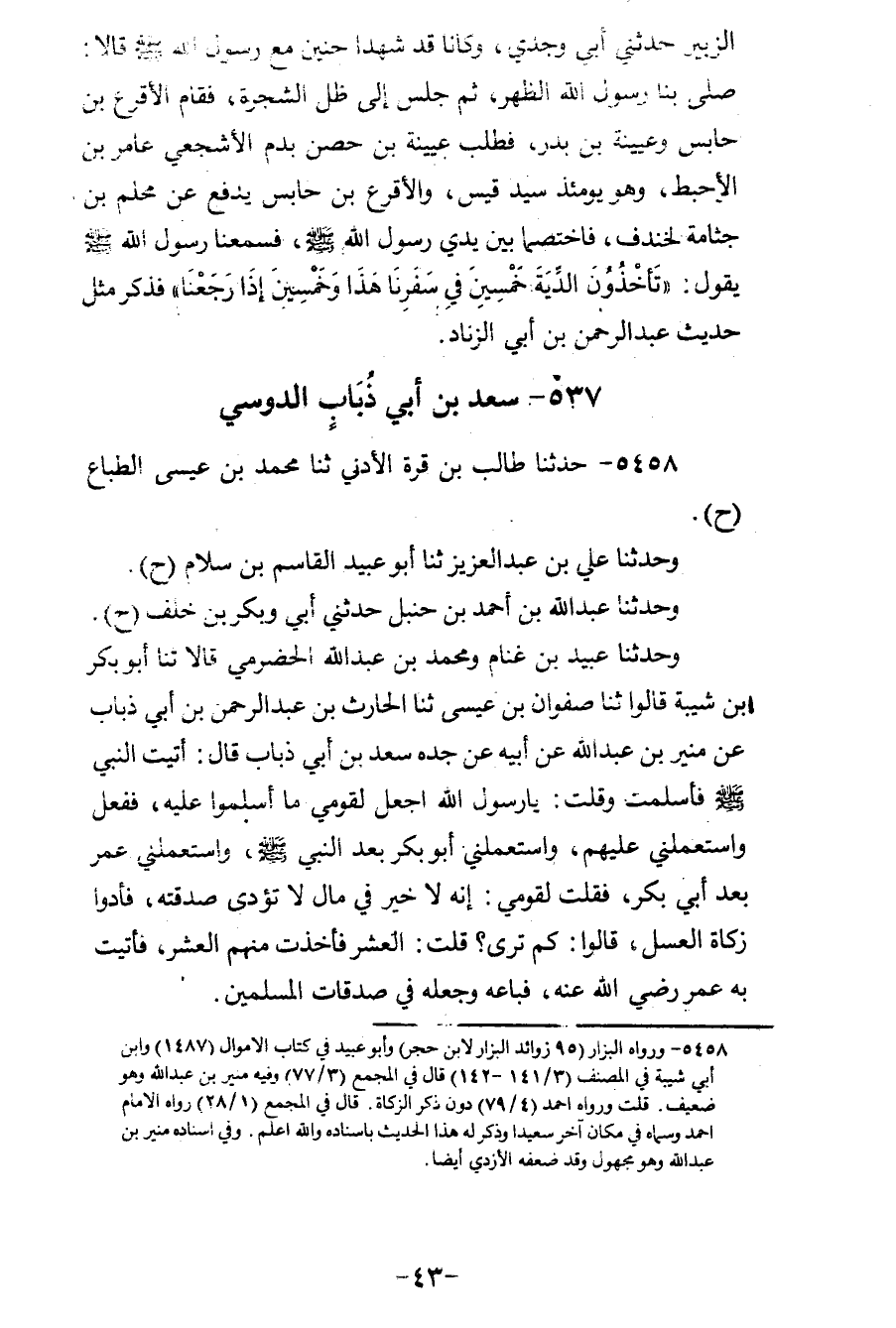 5458 - حَدَّثَنَا طَالِبُ بْنُ قُرَّةَ الْأَدْنَى، ثنا مُحَمَّدُ بْنُ عِيسَى الطَّبَّاعِ، وَحَدَّثَنَا عَلِيُّ بْنُ عَبْدِ الْعَزِيزِ، ثنا أَبُو عُبَيْدٍ الْقَاسِمُ بْنُ سَلَّامٍ، وَحَدَّثَنَا عَبْدُ اللهِ بْنُ أَحْمَدَ بْنِ حَنْبَلٍ، حَدَّثَنِي أَبِي، وَبَكْرُ بْنُ خَلَفٍ، وَحَدَّثَنَا عُبَيْدُ بْنُ غَنَّامٍ، وَمُحَمَّدُ بْنُ عَبْدِ اللهِ الْحَضْرَمِيُّ، قَالَا: ثنا أَبُو بَكْرِ بْنُ أَبِي شَيْبَةَ، قَالُوا: ثنا صَفْوَانُ بْنُ عِيسَى، ثنا الْحَارِثُ بْنُ عَبْدِ الرَّحْمَنِ بْنِ أَبِي ذُبَابٍ، عَنْ مُنِيرِ بْنِ عَبْدِ اللهِ، عَنْ أَبِيهِ، عَنْ جَدِّهِ سَعْدِ بْنِ أَبِي ذُبَابٍ قَالَ: أَتَيْتُ النَّبِيَّ صَلَّى اللهُ عَلَيْهِ وَسَلَّمَ فَأَسْلَمْتُ، وَقُلْتُ: يَا رَسُولَ اللهِ، اجْعَلْ لِقَوْمِي مَا أَسْلَمُوا عَلَيْهِ، «فَفَعَلَ، §وَاسْتَعْمَلَنِي عَلَيْهِمْ» ، وَاسْتَعْمَلَنِي أَبُو بَكْرٍ بَعْدَ النَّبِيِّ صَلَّى اللهُ عَلَيْهِ وَسَلَّمَ، وَاسْتَعْمَلَنِي عُمَرُ بَعْدَ أَبِي بَكْرٍ، فَقُلْتُ لِقَوْمِي: إِنَّهُ لَا خَيْرَ فِي مَالٍ لَا تُؤَدَّى صَدَقَتُهُ، فَأَدُّوا زَكَاةَ الْعَسَلِ، قَالُوا: كَمْ تَرَى؟ قُلْتُ: الْعُشْرَ، فَأَخَذْتُ مِنْهُمُ الْعُشْرَ، فَأَتَيْتُ بِهِ عُمَرَ رَضِيَ اللهُ عَنْهُ، فَبَاعَهُ وَجَعَلَهُ فِي صَدَقَاتِ الْمُسْلِمِينَ