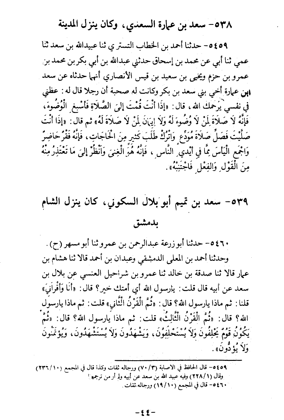 5460 - حَدَّثَنَا أَبُو زُرْعَةَ عَبْدُ الرَّحْمَنِ بْنُ عُمَرَ، ثنا أَبُو مُسْهِرٍ، وَحَدَّثَنَا أَحْمَدُ بْنُ الْمُعَلَّى الدِّمَشْقِيُّ، وَعَبْدَانُ بْنُ أَحْمَدَ، قَالَا: ثنا هِشَامُ بْنُ عَمَّارٍ، قَالَا: ثنا صَدَقَةُ بْنُ خَالِدٍ، ثنا عَمْرُو بْنُ شَرَاحِيلَ الْعَنْسِيُّ، عَنْ بِلَالِ بْنِ سَعْدٍ، عَنْ أَبِيهِ قَالَ: قُلْتُ: يَا رَسُولَ اللهِ، §أَيُّ أُمَّتِكَ خَيْرٌ؟ قَالَ: «أَنَا وَأَقْرَانِي» . قُلْنَا: ثُمَّ مَاذَا يَا رَسُولَ اللهِ؟ قَالَ: «، ثُمَّ الْقَرْنُ الثَّانِي» . قُلْتُ: ثُمَّ مَاذَا يَا رَسُولَ اللهِ؟ قَالَ: «، ثُمَّ الْقَرْنُ الثَّالِثُ» . قُلْتُ: ثُمَّ مَاذَا يَا رَسُولَ اللهِ؟ قَالَ: «، ثُمَّ يَكُونُ قَوْمٌ يَحْلِفُونَ وَلَا يُسْتَحْلَفُونَ، وَيَشْهَدُونَ وَلَا يُسْتَشْهَدُونَ، ويُؤْتَمَنُونَ وَلَا يُؤَدُّونَ»