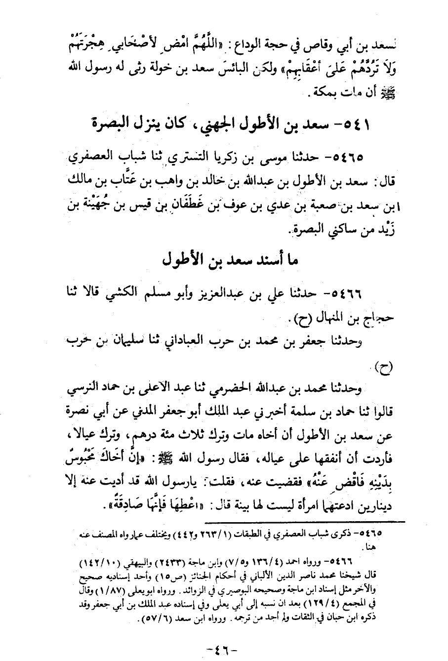 5465 - حَدَّثَنَا مُوسَى بْنُ زَكَرِيَّا التُّسْتَرِيُّ، ثنا شَبَابٌ الْعُصْفُرِيُّ قَالَ: «§سَعْدُ بْنُ الْأَطْوَلِ بْنِ عَبْدِ اللهِ بْنِ خَالِدِ بْنِ وَاهِبِ بْنِ عَتَّابِ بْنِ مَالِكِ بْنِ سَعْدِ بْنِ صَعْبَةِ بْنِ عَدِيِّ بْنِ عَوْفِ بْنِ غَطَفَانِ بْنِ قَيْسِ بْنِ جُهَيْنَةَ بْنِ زَيْدٍ مِنْ سَاكِنِي الْبَصْرَةِ»