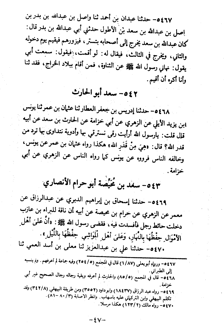 5467 - حَدَّثَنَا عَبْدَانُ بْنُ أَحْمَدَ، ثنا وَاصِلُ بْنُ عَبْدِ اللهِ بْنِ بَدْرِ بْنِ أَصْلِ بْنِ عَبْدِ اللهِ بْنِ سَعْدِ بْنِ الْأَطْوَلِ، حَدَّثَنِي أَبِي عَبْدُ اللهِ بْنُ بَدْرٍ، قَالَ: كَانَ عَبْدُ اللهِ بْنُ سَعْدٍ يَخْرُجُ إِلَى أَصْحَابِهِ بِتُسْتَرَ، فَيَزُورُهُمْ فَيُقِيمُ يَوْمَ دُخُولِهِ وَالثَّانِي وَيَخْرُجُ فِي الثَّالِثِ، فَيُقَالُ لَهُ: لَوْ أَقَمْتَ، فَيَقُولُ: سَمِعْتُ أَبِي يَقُولُ: §نَهَانِي رَسُولُ اللهِ صَلَّى اللهُ عَلَيْهِ وَسَلَّمَ عَنِ الثَّنَاوَةِ فَمَنْ أَقَامَ بِبِلَادِ الْخَرَاجِ، فَقَدْ ثنا وَأَنَا أَكْرَهُ أَنْ أُقِيمَ "
