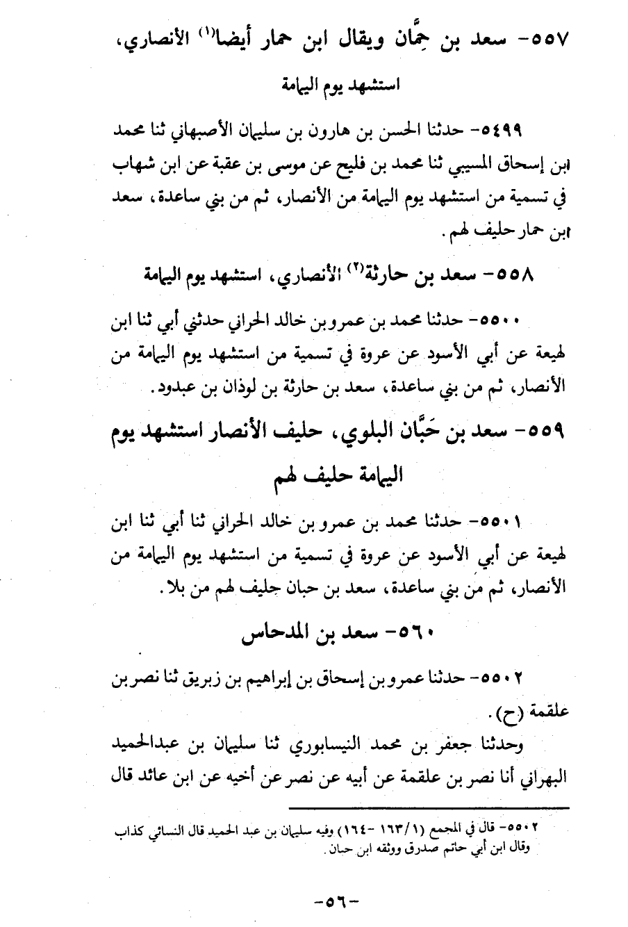 5501 - حَدَّثَنَا مُحَمَّدُ بْنُ عَمْرِو بْنِ خَالِدٍ الْحَرَّانِيُّ، ثنا أَبِي، ثنا ابْنُ لَهِيعَةَ، عَنْ أَبِي الْأَسْوَدِ، عَنْ عُرْوَةَ: «§فِي تَسْمِيَةِ مَنِ اسْتُشْهِدَ يَوْمَ الْيَمَامَةِ مِنَ الْأَنْصَارِ، ثُمَّ مِنْ بَنِي سَاعِدَةَ، سَعْدُ بْنُ حِبَّانَ، حَلِيفٌ لَهُمْ مِنْ بِلَيٍّ»