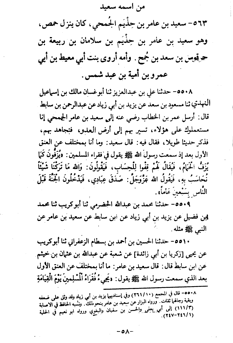5510 - حَدَّثَنَا الْحُسَيْنُ بْنُ أَحْمَدَ بْنِ بِسْطَامٍ الزَّعْفَرَانِيُّ، ثنا أَبُو كُرَيْبٍ، عَنْ يَحْيَى بْنِ زَكَرِيَّا بْنِ أَبِي زَائِدَةَ، عَنْ شُعْبَةَ، عَنْ عَبْدِ اللهِ بْنِ عُثْمَانَ بْنِ خَيْثَمٍ، عَنِ ابْنِ سَابِطٍ قَالَ: قَالَ سَعِيدُ بْنُ عَامِرٍ: مَا أَنَا بِمُخْتَلِفٍ عَنِ الْعَنَقِ الْأَوَّلِ بَعْدَ الَّذِي سَمِعْتُ رَسُولَ اللهِ صَلَّى اللهُ عَلَيْهِ وَسَلَّمَ يَقُولُ: " §يَجِيءُ فُقَرَاءُ الْمُسْلِمِينَ يَوْمَ الْقِيَامَةِ عَلَى كُورِهِمْ، فَيُقَالُ لَهُمْ: قِفُوا لِلْحِسَابِ، فَيَقُولُونَ: مَا أَعْطَيْتُمُونَا شَيْئًا فَتُحَاسِبُونَا عَلَيْهِ، فَيَدْخُلُونَ الْجَنَّةَ قَبْلَ النَّاسِ بِأَرْبَعِينَ سَنَةً "