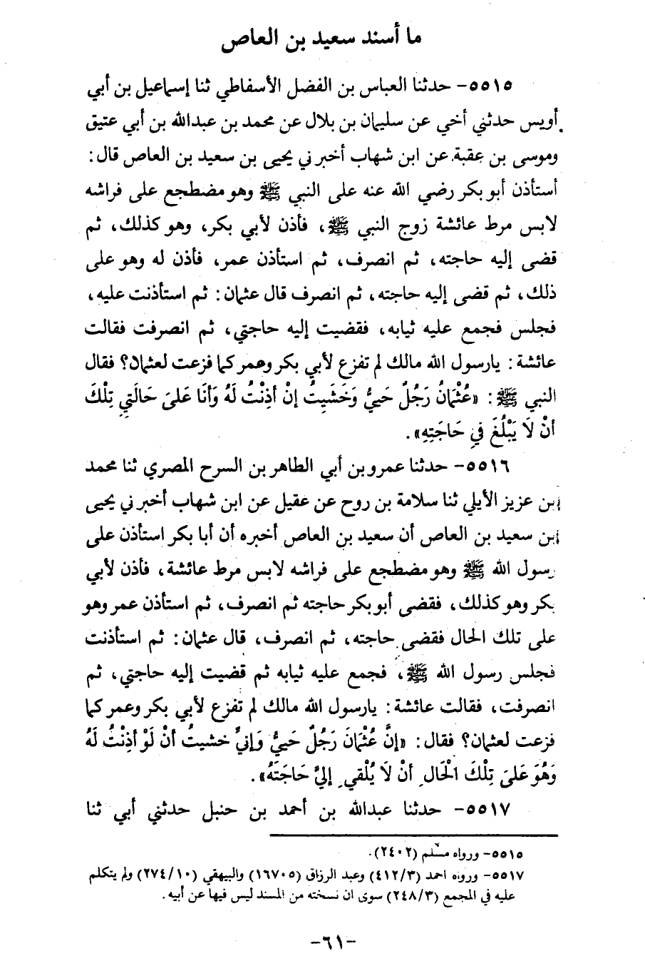 5516 - حَدَّثَنَا عَمْرُو بْنُ أَبِي الطَّاهِرِ بْنِ السَّرْحِ الْمِصْرِيُّ، ثنا مُحَمَّدُ بْنُ عَزِيزٍ الْأَيْلِيُّ، ثنا سَلَامَةُ بْنُ رَوْحٍ، عَنْ عَقِيلٍ، عَنِ ابْنِ شِهَابٍ، أَخْبَرَنِي يَحْيَى بْنُ سَعِيدِ بْنِ الْعَاصِ، أَنَّ سَعِيدَ بْنَ الْعَاصِ أَخْبَرَهُ: أَنَّ أَبَا بَكْرٍ اسْتَأْذَنَ عَلَى رَسُولِ اللهِ صَلَّى اللهُ عَلَيْهِ وَسَلَّمَ وَهُوَ مُضْطَجِعٌ عَلَى فِرَاشِهِ، لَابِسٌ مِرْطَ عَائِشَةَ فَأَذِنَ لِأَبِي بَكْرٍ وَهُوَ كَذَلِكَ، فَقَضَى أَبُو بَكْرٍ حَاجَتَهُ، ثُمَّ انْصَرَفَ، ثُمَّ اسْتَأْذَنَ عُمَرُ وَهُوَ عَلَى تِلْكَ الْحَالِ، فَقَضَى حَاجَتَهُ، ثُمَّ انْصَرَفَ قَالَ عُثْمَانُ: ثُمَّ اسْتَأْذَنْتُ، فَجَلَسَ رَسُولُ اللهِ صَلَّى اللهُ عَلَيْهِ وَسَلَّمَ، فَجَمَعَ عَلَيْهِ ثِيَابَهُ، ثُمَّ قَضَيْتُ إِلَيْهِ حَاجَتِي، ثُمَّ انْصَرَفْتُ، فَقَالَتْ عَائِشَةُ: يَا رَسُولَ اللهِ، مَا لَكَ لَمْ تَفْزَعْ لِأَبِي بَكْرٍ، وَعُمَرَ، كَمَا فَزِعْتَ لِعُثْمَانَ؟ فَقَالَ: «إِنَّ §عُثْمَانَ رَجُلٌ حَيِيٌّ، وَإِنِّي خَشِيتُ أَنْ لَوْ أَذِنْتُ لَهُ وَهُوَ عَلَى تِلْكَ الْحَالِ أَنْ لَا يُلْقِيَ إِلَيَّ حَاجَتَهُ»