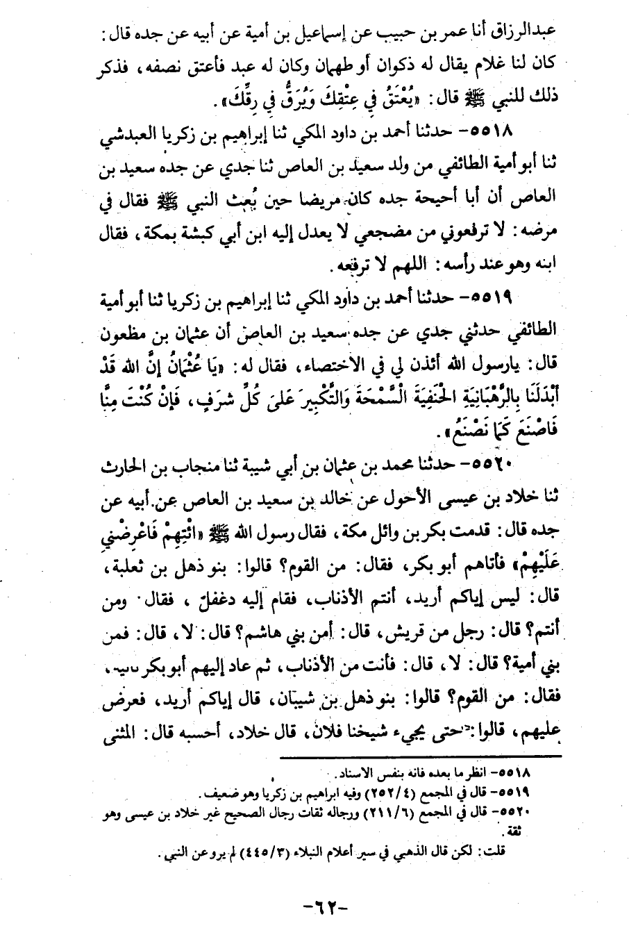 5519 - حَدَّثَنَا أَحْمَدُ بْنُ دَاوُدَ الْمَكِّيُّ، ثنا إِبْرَاهِيمُ بْنُ زَكَرِيَّا، ثنا أَبُو أُمَيَّةَ الطَّائِفِيُّ، حَدَّثَنِي جَدِّي، عَنْ جَدِّهِ سَعِيدِ بْنِ الْعَاصِ: أَنَّ عُثْمَانَ بْنَ مَظْعُونٍ قَالَ: يَا رَسُولَ اللهِ، ائْذَنْ لِي فِي الِاخْتِصَاءِ، فَقَالَ لَهُ: «يَا عُثْمَانُ، إِنَّ §اللهَ قَدْ أَبْدَلَنَا بِالرَّهْبَانِيَّةِ الْحَنَفِيَّةَ السَّمْحَةَ، وَالتَّكْبِيرَ عَلَى كُلِّ شَرَفٍ، فَإِنْ كُنْتَ مِنَّا فَاصْنَعْ كَمَا نَصْنَعُ»