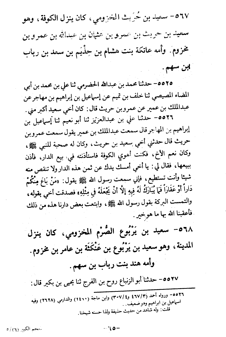 5526 - حَدَّثَنَا عَلِيُّ بْنُ عَبْدِ الْعَزِيزِ، ثنا أَبُو نُعَيْمٍ، ثنا إِسْمَاعِيلُ بْنُ إِبْرَاهِيمَ بْنِ الْمُهَاجِرِ، قَالَ: سَمِعْتُ عَبْدَ الْمَلِكِ بْنَ عُمَيْرٍ، يَقُولُ: سَمِعْتُ عَمْرَو بْنَ حُرَيْثٍ، قَالَ: حَدَّثَنِي أَخِي سَعِيدُ بْنُ حُرَيْثٍ، وَكَانَ لَهُ صُحْبَةٌ لِلنَّبِيِّ صَلَّى اللهُ عَلَيْهِ وَسَلَّمَ، وَكَانَ نِعْمَ الْأَخُ، فَكُنْتُ أَهْوَى الْكُوفَةَ، فَاسْتَأْذَنْتُهُ فِي بَيْعِ الدَّارِ، فَأَذِنَ بِبَيْعِهَا، فَقَالَ لِي: يَا أَخِي، أَمْسِكْ يَدَكَ عَنْ ثَمَنِ هَذِهِ الدَّارِ، وَلَا تُنْقِصْ مِنْهُ شَيْئًا، وَأَنْتَ تَسْتَطِيعُ، فَإِنِّي سَمِعْتُ رَسُولَ اللهِ صَلَّى اللهُ عَلَيْهِ وَسَلَّمَ يَقُولُ: «§مَنْ بَاعَ مِنْكُمْ دَارًا أَوْ عَقَارًا، فَمَا يُبَارَكُ لَهُ فِيهِ إِلَّا أَنْ يَجْعَلَهُ فِي مِثْلِهِ» ، فَصَدَّقْتُ أَخِي بِقَوْلِهِ، وَالْتَمَسْتُ الْبَرَكَةَ بِقَوْلِ رَسُولِ اللهِ صَلَّى اللهُ عَلَيْهِ وَسَلَّمَ، وَابْتَعْتُ بَعْضَ دَارِنَا هَذِهِ مِنْ ذَلِكَ، فَأعْقَبَنَا اللهُ بِهَا مَا هُوَ خَيْرٌ