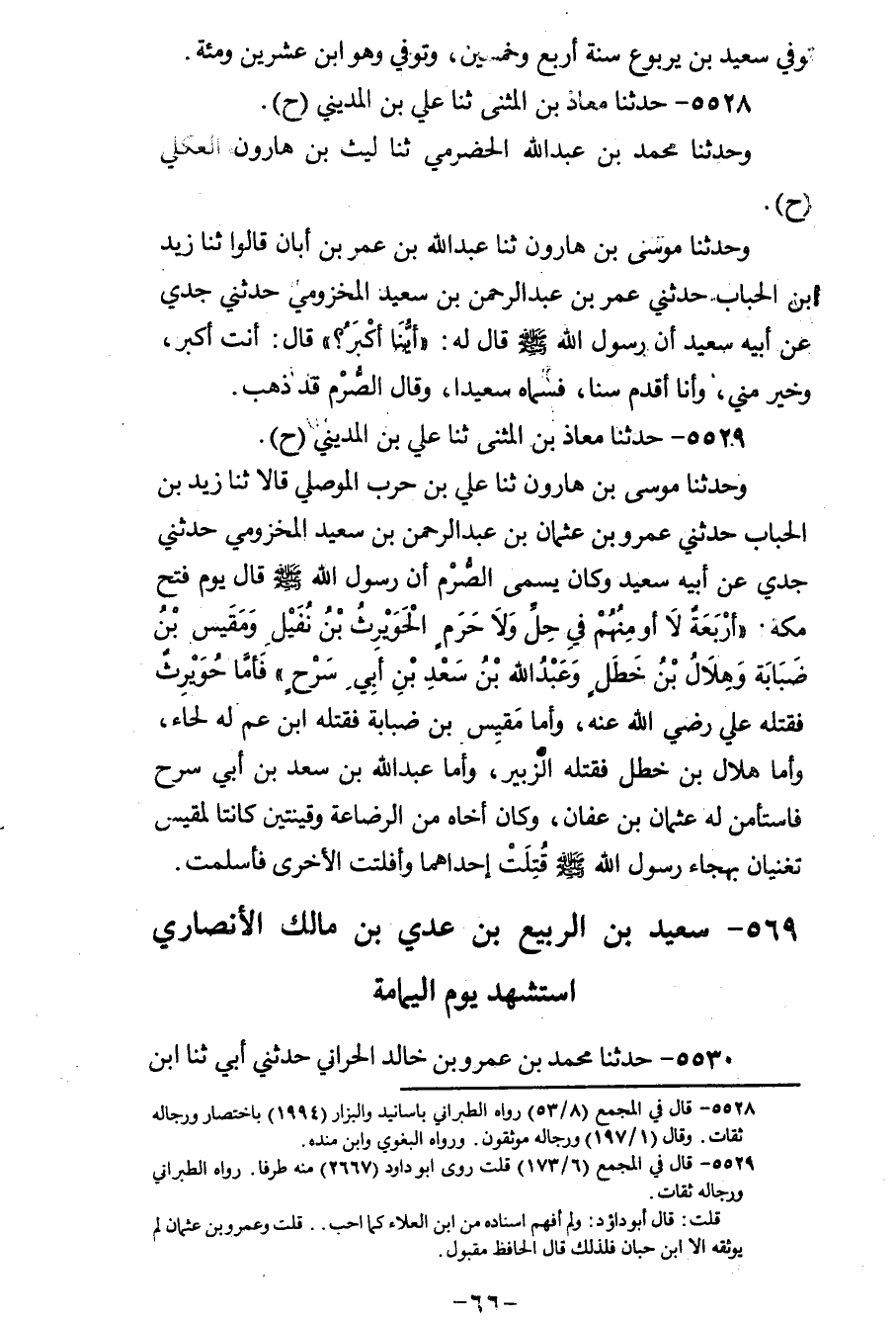 5529 - حَدَّثَنَا مُعَاذُ بْنُ الْمُثَنَّى، ثنا عَلِيُّ بْنُ الْمَدِينِيِّ، وَحَدَّثَنَا مُوسَى بْنُ هَارُونَ، ثنا عَلِيُّ بْنُ حَرْبٍ الْمَوْصِلِيُّ، قَالَا: ثنا زَيْدُ بْنُ الْحُبَابِ، حَدَّثَنِي عَمْرُو بْنُ عُثْمَانَ بْنِ عَبْدِ الرَّحْمَنِ بْنِ سَعِيدٍ الْمَخْزُومِيُّ، حَدَّثَنِي جَدِّي، عَنْ أَبِيهِ سَعِيدٍ، وَكَانَ يُسَمَّى الصَّرْمَ، أَنَّ رَسُولَ اللهِ صَلَّى اللهُ عَلَيْهِ وَسَلَّمَ قَالَ يَوْمَ فَتْحِ مَكَّةَ: " §أَرْبَعَةٌ لَا أُوَمِّنُهُمْ فِي حَلٍّ وَلَا حَرَمٍ: الْحُوَيْرِثُ بْنُ نُفَيْلٍ، وَمَقِيسُ بْنُ ضَبَابَةَ، وَهِلَالُ بْنُ خَطَلٍ، وَعَبْدُ اللهِ بْنُ سَعْدِ بْنِ أَبِي سَرْحٍ "، فَأَمَّا حُوَيْرِثُ فَقَتَلَهُ عَلِيٌّ رَضِيَ اللهُ عَنْهُ، وَأَمَّا مَقِيسُ بْنُ ضَبَابَةَ فَقَتَلَهُ ابْنُ عَمٍّ لَهُ لِحَاءً، وَأَمَّا هِلَالُ بْنُ خَطَلٍ فَقَتَلَهُ الزُّبَيْرُ، وَأَمَّا عَبْدُ اللهِ بْنُ سَعْدِ بْنِ أَبِي سَرْحٍ فَاسْتَأْمَنَ لَهُ عُثْمَانُ بْنُ عَفَّانَ، وَكَانَ أَخَاهُ مِنَ الرَّضَاعَةِ، وَقَيْنَتَيْنِ كَانَتَا لِمِقْيَسٍ، تُغَنِّيَانِ بِهِجَاءِ رَسُولِ اللهِ صَلَّى اللهُ عَلَيْهِ وَسَلَّمَ، قُتِلَتْ إِحْدَاهُمَا، وَأَفْلَتَتِ الْأُخْرَى فَأَسْلَمَتْ