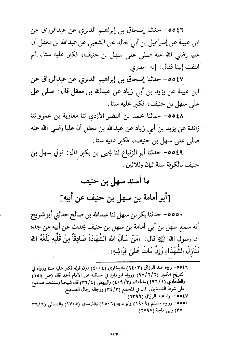 5546 - حَدَّثَنَا إِسْحَاقُ بْنُ إِبْرَاهِيمَ الدَّبَرِيُّ، عَنْ عَبْدِ الرَّزَّاقِ، عَنِ ابْنِ عُيَيْنَةَ، عَنْ إِسْمَاعِيلَ بْنِ أَبِي خَالِدٍ، عَنِ الشَّعْبِيِّ، عَنْ عَبْدِ اللهِ بْنِ مَعْقِلٍ، أَنَّ عَلِيًّا رَضِيَ اللهُ عَنْهُ صَلَّى عَلَى سَهْلِ بْنِ حُنَيْفٍ، فَكَبَّرَ عَلَيْهِ سِتًّا، ثُمَّ الْتَفَتَ إِلَيْنَا فَقَالَ: «§إِنْهُ بَدْرِيٌّ»