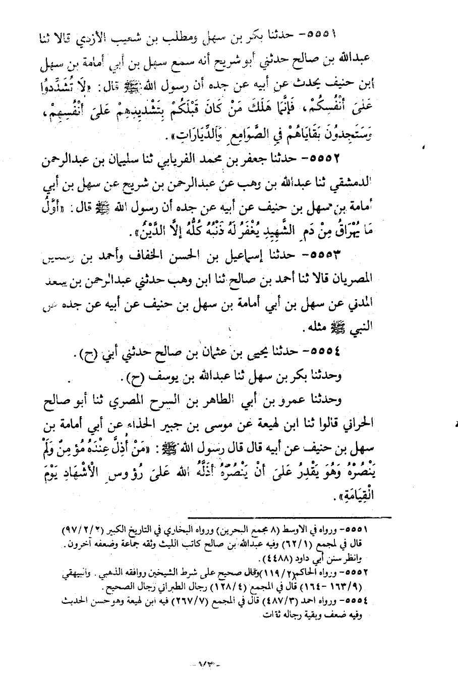 5551 - حَدَّثَنَا بَكْرُ بْنُ سَهْلٍ، وَمُطَّلِبُ بْنُ شُعَيْبٍ الْأَزْدِيُّ، قَالَا: ثنا عَبْدُ اللهِ بْنُ صَالِحٍ، حَدَّثَنِي أَبُو شُرَيْحٍ أَنَّهُ: سَمِعَ سَهْلَ بْنَ أَبِي أُمَامَةَ بْنِ سَهْلِ بْنِ حُنَيْفٍ يُحَدِّثُ، عَنْ أَبِيهِ، عَنْ جَدِّهِ أَنَّ رَسُولَ اللهِ صَلَّى اللهُ عَلَيْهِ وَسَلَّمَ قَالَ: «§لَا تُشَدِّدُوا عَلَى أَنْفُسِكُمْ، فَإِنَّمَا هَلَكَ مَنْ كَانَ قَبْلَكُمْ بِتَشْدِيدهِمْ عَلَى أَنْفُسِهِمْ، وَسَتَجِدُونَ بَقَايَاهُمْ فِي الصَّوَامِعِ وَالدِّيَارَاتِ»