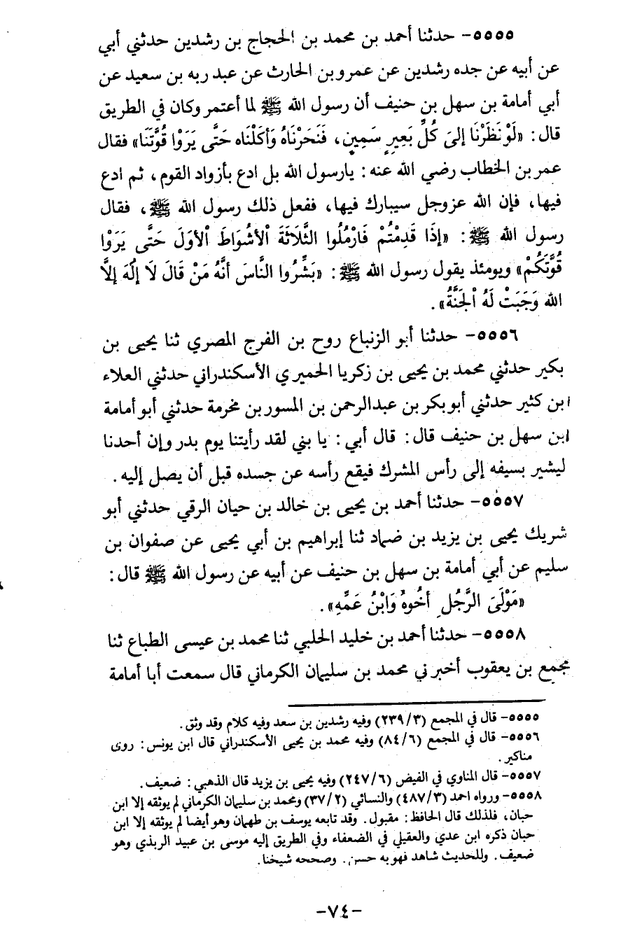 5555 - حَدَّثَنَا أَحْمَدُ بْنُ مُحَمَّدِ بْنِ الْحَجَّاجِ بْنِ رِشْدِينَ، حَدَّثَنِي أَبِي، عَنْ أَبِيهِ، عَنْ جَدِّهِ رِشْدِينَ، عَنْ عَمْرِو بْنِ الْحَارِثِ، عَنْ عَبْدِ رَبِّهِ بْنِ سَعِيدٍ، عَنْ أَبِي أُمَامَةَ بْنِ سَهْلِ بْنِ حُنَيْفٍ: أَنَّ رَسُولَ اللهِ صَلَّى اللهُ عَلَيْهِ وَسَلَّمَ لَمَّا اعْتَمَرَ وَكَانَ فِي الطَّرِيقِ قَالَ: «§لَوْ نَظَرْنَا إِلَى كُلِّ بَعِيرٍ سَمِينٍ فَنَحَرْنَاهُ وأَكَلْنَاهُ حَتَّى يَرَوْا قُوَّتَنَا» ، فَقَالَ عُمَرُ بْنُ الْخَطَّابِ رَضِيَ اللهُ عَنْهُ: يَا رَسُولَ اللهِ، بَلِ ادْعُ بِأَزْوَادِ الْقَوْمِ، ثُمَّ ادْعُ فِيهَا، فَإِنَّ اللهَ عَزَّ وَجَلَّ سَيُبَارِكُ فِيهَا، فَفَعَلَ ذَلِكَ رَسُولُ اللهِ صَلَّى اللهُ عَلَيْهِ وَسَلَّمَ، فَقَالَ رَسُولُ اللهِ صَلَّى اللهُ عَلَيْهِ وَسَلَّمَ: «إِذَا قَدِمْتُمْ فَارْمُلُوا الثَّلَاثَةَ الْأَشْوَاطَ، الْأُوَلَ حَتَّى يَرَوْا قُوَّتَكُمْ»