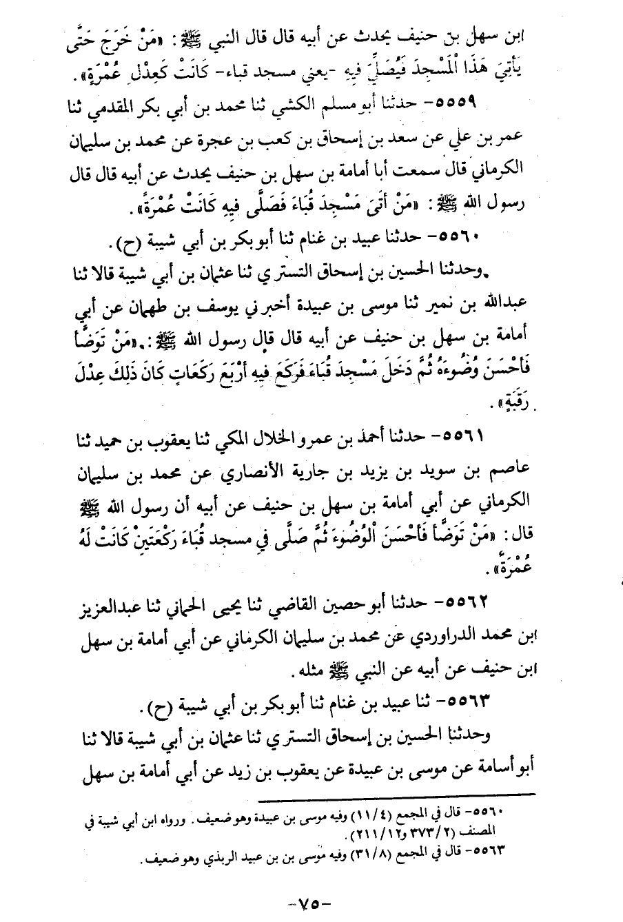 5560 - حَدَّثَنَا عُبَيْدُ بْنُ غَنَّامٍ، ثنا أَبُو بَكْرِ بْنُ أَبِي شَيْبَةَ، ح وَحَدَّثَنَا الْحُسَيْنُ بْنُ إِسْحَاقَ التُّسْتَريُّ، ثنا عُثْمَانُ بْنُ أَبِي شَيْبَةَ، قَالَا: ثنا عَبْدُ اللهِ بْنُ نُمَيْرٍ، ثنا مُوسَى بْنُ عُبَيْدَةَ، أَخْبَرَنِي يُوسُفُ بْنُ طَهْمَانَ، عَنْ أَبِي أُمَامَةَ بْنِ سَهْلِ بْنِ حُنَيْفٍ، عَنْ أَبِيهِ قَالَ: قَالَ رَسُولُ اللهِ صَلَّى اللهُ عَلَيْهِ وَسَلَّمَ: «§مَنْ تَوَضَّأَ فَأَحْسَنَ وُضُوءَهُ، ثُمَّ دَخَلَ مَسْجِدَ قُبَاءَ فَرَكَعَ فِيهِ أَرْبَعَ رَكَعَاتٍ، كَانَ ذَلِكَ عَدْلَ رَقَبَةٍ»