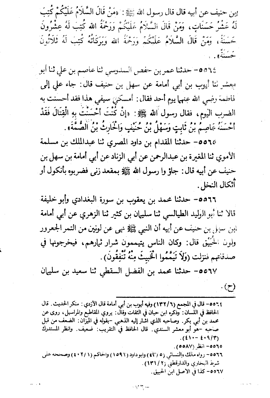 5564 - حَدَّثَنَا عُمَرُ بْنُ حَفْصٍ السَّدُوسِيُّ، ثنا عَاصِمُ بْنُ عَلِيٍّ، ثنا أَبُو مَعْشَرٍ، ثنا أَيُّوبُ بْنُ أَبِي أُمَامَةَ، عَنْ سَهْلِ بْنِ حُنَيْفٍ قَالَ: جَاءَ عَلِيٌّ إِلَى فَاطِمَةَ رَضِيَ اللهُ عَنْهُمَا يَوْمَ أُحُدٍ، فَقَالَ: أَمْسِكِي سَيْفِي هَذَا، فَقَدْ أَحْسَنْتُ بِهِ الضَّرْبَ الْيَوْمَ، فَقَالَ رَسُولُ اللهِ صَلَّى اللهُ عَلَيْهِ وَسَلَّمَ: «§إِنْ كُنْتَ أَحْسَنْتَ بِهِ الْقِتَالَ، فَقَدْ أَحْسَنَهُ عَاصِمُ بْنُ ثَابِتٍ، وَسَهْلُ بْنُ حُنَيْفٍ، وَالْحَارِثُ بْنُ الصِّمَّةِ»