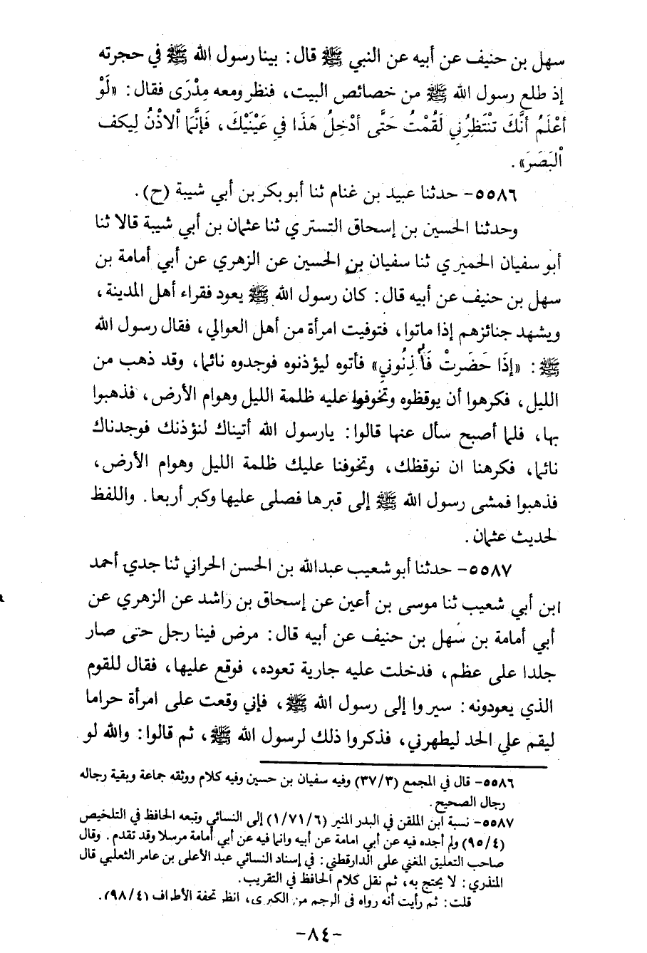 5586 - حَدَّثَنَا عُبَيْدُ بْنُ غَنَّامٍ، ثنا أَبُو بَكْرِ بْنُ أَبِي شَيْبَةَ، ح وَحَدَّثَنَا الْحُسَيْنُ بْنُ إِسْحَاقَ التُّسْتَرِيُّ، ثنا عُثْمَانُ بْنُ أَبِي شَيْبَةَ قَالَا: ثنا أَبُو سُفْيَانَ الْحِمْيَرِيُّ، ثنا سُفْيَانُ بْنُ الْحُسَيْنِ، عَنِ الزُّهْرِيِّ، عَنْ أَبِي أُمَامَةَ بْنِ سَهْلِ بْنِ حُنَيْفٍ، عَنْ أَبِيهِ قَالَ: كَانَ رَسُولُ اللهِ صَلَّى اللهُ عَلَيْهِ وَسَلَّمَ يَعُودُ فُقَرَاءَ أَهْلِ الْمَدِينَةِ، وَيَشْهَدُ جَنَائِزَهُمْ إِذَا مَاتُوا، فَتُوُفِّيَتِ امْرَأَةٌ مِنْ أَهْلِ الْعَوَالِي، فَقَالَ رَسُولُ اللهِ صَلَّى اللهُ عَلَيْهِ وَسَلَّمَ: «§إِذَا حَضَرَتْ فَآذِنُونِي» فَأَتَوْهُ لِيُئْذِنُوهُ، فَوَجَدُوهُ نَائِمًا، وَقَدْ ذَهَبَ مِنَ اللَّيْلِ، فَكَرِهُوا أَنْ يُوقِظُوهُ، وتَخَوَّفُوا عَلَيْهِ ظُلْمَةَ اللَّيْلِ، وهَوَامَّ الْأَرْضِ، فَذَهَبُوا بِهَا، فَلَمَّا أَصْبَحَ سَأَلَ عَنْهَا، قَالُوا: يَا رَسُولَ اللهِ، أَتَيْنَاكَ لِنُؤْذِنَكَ، فَوَجَدْنَاكَ نَائِمًا، فَكَرِهْنَا أَنْ نُوقِظَكَ، وتَخَوَّفْنَا عَلَيْكَ ظُلْمَةَ اللَّيْلِ وهَوَامَّ الْأَرْضِ، فَذَهَبُوا، فَمَشَى رَسُولُ اللهِ صَلَّى اللهُ عَلَيْهِ وَسَلَّمَ إِلَى قَبْرِهَا، فَصَلَّى عَلَيْهَا وَكَبَّرَ أَرْبَعًا وَاللَّفْظُ لِحَدِيثِ عُثْمَانَ