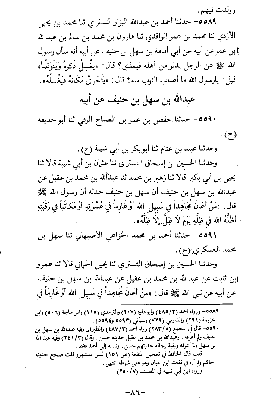5590 - حَدَّثَنَا حَفْصُ بْنُ عُمَرَ بْنِ الصَّبَّاحِ الرَّقِّيُّ، ثنا أَبُو حُذَيْفَةَ، ح وَحَدَّثَنَا عُبَيْدُ بْنُ غَنَّامٍ، ثنا أَبُو بَكْرِ بْنُ أَبِي شَيْبَةَ، ح وَحَدَّثَنَا الْحُسَيْنُ بْنُ إِسْحَاقَ التُّسْتَرِيُّ، ثنا عُثْمَانُ بْنُ أَبِي شَيْبَةَ، قَالَا: ثنا يَحْيَى بْنُ أَبِي بُكَيْرٍ، قَالَا: ثنا زُهَيْرُ بْنُ مُحَمَّدٍ، ثنا عَبْدُ اللهِ بْنُ مُحَمَّدِ بْنِ عَقِيلٍ، عَنْ عَبْدِ اللهِ بْنِ سَهْلِ بْنِ حُنَيْفٍ، أَنَّ سَهْلَ بْنَ حُنَيْفٍ، حَدَّثَهُ، أَنَّ رَسُولَ اللهِ صَلَّى اللهُ عَلَيْهِ وَسَلَّمَ قَالَ: «§مَنْ أَعَانَ مُجَاهِدًا فِي سَبِيلِ اللهِ، أَوْ غَارِمًا فِي عُسْرَتِهِ، أَوْ مُكَاتِبًا فِي رَقَبَتِهِ، أَظَلَّهُ اللهُ فِي ظِلِّهِ يَوْمَ لَا ظِلَّ إِلَّا ظِلَّهُ»