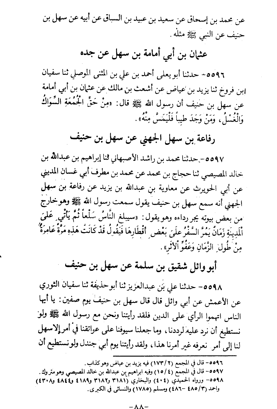 5596 - حَدَّثَنَا أَبُو يَعْلَى أَحْمَدُ بْنُ عَلِيِّ بْنِ الْمُثَنَّى الْمَوْصِلِيُّ، ثنا شَيْبَانُ بْنُ فَرُّوخَ، ثنا يَزِيدُ بْنُ عِيَاضٍ، عَنْ أَشْعَثَ بْنِ مَالِكٍ، عَنْ عُثْمَانَ بْنِ أَبِي أُمَامَةَ، عَنْ سَهْلِ بْنِ حُنَيْفٍ، أَنَّ رَسُولَ اللهِ صَلَّى اللهُ عَلَيْهِ وَسَلَّمَ قَالَ: «§مِنْ حَقِّ الْجُمُعَةِ السِّوَاكُ، وَالْغُسْلُ، وَمَنْ وَجَدَ طِيبًا فَلْيَمَسَّ مِنْهُ»
