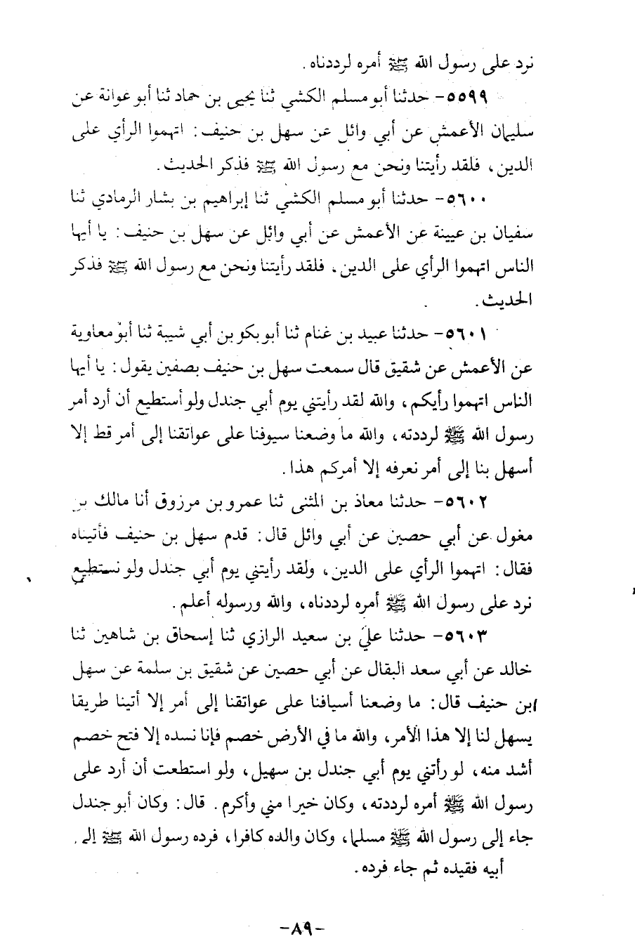 5599 - حَدَّثَنَا أَبُو مُسْلِمٍ الْكَشِّيُّ، ثنا يَحْيَى بْنُ حَمَّادٍ، ثنا أَبُو عَوَانَةَ، عَنْ سُلَيْمَانَ الْأَعْمَشِ، عَنْ أَبِي وَائِلٍ، عَنْ سَهْلِ بْنِ حُنَيْفٍ، «§اتَّهِمُوا الرَّأْيَ عَلَى الدِّينِ، فَلَقَدْ رَأَيْتُنَا وَنَحْنُ مَعَ رَسُولِ اللهِ صَلَّى اللهُ عَلَيْهِ وَسَلَّمَ» ، فَذَكَرَ الْحَدِيثَ