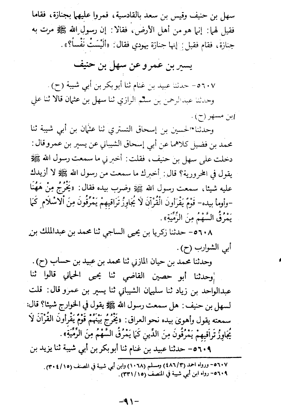 5608 - حَدَّثَنَا زَكَرِيَّا بْنُ يَحْيَى السَّاجِيُّ، ثنا مُحَمَّدُ بْنُ عَبْدِ الْمَلِكِ بْنِ أَبِي الشَّوَارِبِ، ح وَحَدَّثَنَا مُحَمَّدُ بْنُ حَيَّانَ الْمَازِنِيُّ، ثنا مُحَمَّدُ بْنُ عُبَيْدِ بْنِ حِسَابٍ، ح وَحَدَّثَنَا أَبُو حُصَيْنٍ الْقَاضِي، ثنا يَحْيَى الْحِمَّانِيُّ، قَالُوا: ثنا عَبْدُ الْوَاحِدِ بْنُ زِيَادٍ، ثنا سُلَيْمَانُ الشَّيْبَانِيُّ، ثنا يَسِيرُ بْنُ عَمْرٍو، قَالَ: قُلْتُ لِسَهْلِ بْنِ حُنَيْفٍ: هَلْ سَمِعْتَ رَسُولَ اللهِ صَلَّى اللهُ عَلَيْهِ وَسَلَّمَ يَقُولُ فِي الْخَوَارِجِ شَيْئًا؟ قَالَ: سَمِعْتُهُ يَقُولُ وَأَهْوَى بِيَدِهِ نَحْوَ الْعِرَاقِ: «§يَخْرُجُ بَيْنَهُمْ قَوْمٌ يَقْرَأُونَ الْقُرْآنَ، لَا يُجَاوِزُ تَرَاقِيَهُمْ، يَمْرُقُونَ مِنَ الدِّينِ كَمَا يَمْرُقُ السَّهْمُ مِنَ الرَّمِيَّةِ»