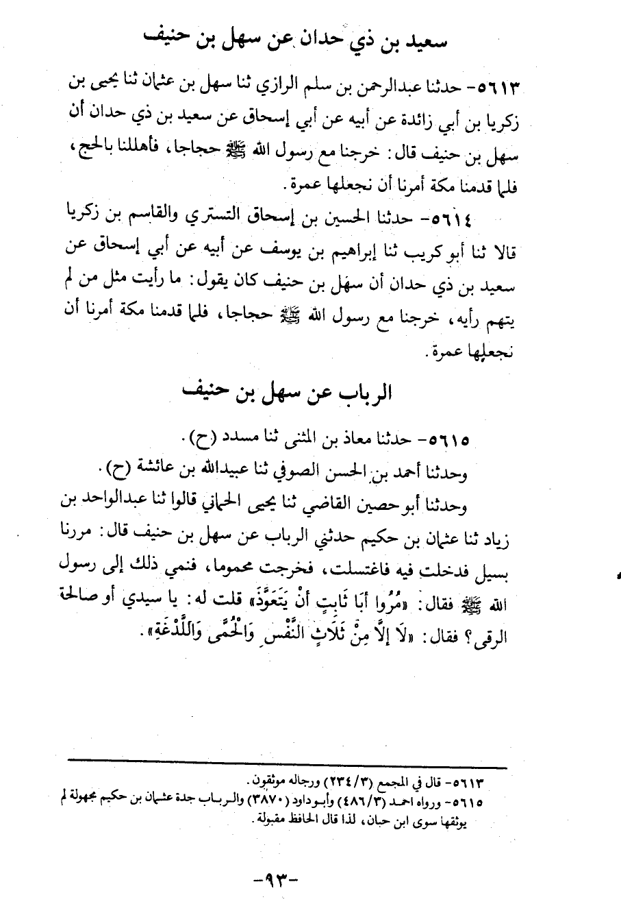 5615 - حَدَّثَنَا مُعَاذُ بْنُ الْمُثَنَّى، ثنا مُسَدَّدٌ، ح وَحَدَّثَنَا أَحْمَدُ بْنُ الْحَسَنِ الصُّوفِيُّ، ثنا عُبَيْدُ اللهِ بْنُ عَائِشَةَ، ح وَحَدَّثَنَا أَبُو حُصَيْنٍ الْقَاضِي، ثنا يَحْيَى الْحِمَّانِيُّ، قَالُوا: ثنا عَبْدُ الْوَاحِدِ بْنِ زِيَادٍ، ثنا عُثْمَانُ بْنُ حَكِيمٍ، حَدَّثَتْنِي الرَّبَابُ، عَنْ سَهْلِ بْنِ حُنَيْفٍ قَالَ: مَرَرْنَا بِسَيْلٍ، فَدَخَلْتُ فِيهِ، فَاغْتَسَلْتُ فَخَرَجْتُ مَحْمُومًا، فَنَمَى ذَلِكَ إِلَى رَسُولِ اللهِ صَلَّى اللهُ عَلَيْهِ وَسَلَّمَ فَقَالَ: «§مُرُوا أَبَا ثَابِتٍ أَنْ يَتَعَوَّذَ» ، قُلْتُ لَهُ: يَا سَيِّدِي، أَوَصَالِحَةٌ الرُّقَى؟ فَقَالَ: " لَا، إِلَّا مِنْ ثَلَاثٍ: النَّفْسِ، وَالْحُمَّى، وَاللَّدْغَةِ "