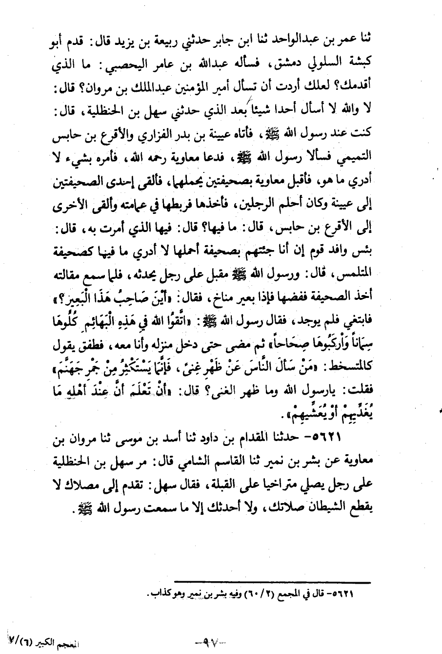 5621 - حَدَّثَنَا الْمِقْدَامُ بْنُ دَاوُدَ، ثنا أَسَدُ بْنُ مُوسَى، ثنا مَرْوَانُ بْنُ مُعَاوِيَةَ، عَنْ بِشْرِ بْنِ نُمَيْرٍ، ثنا الْقَاسِمُ الشَّامِيُّ، قَالَ: مَرَّ سَهْلُ ابْنُ الْحَنْظَلِيَّةِ عَلَى رَجُلٍ يُصَلِّي مُتَرَاخِيًا عَلَى الْقِبْلَةِ، فَقَالَ سَهْلٌ: «§تَقَدَّمْ إِلَى مُصَلَّاكَ، لَا يَقْطَعِ الشَّيْطَانُ صَلَاتَكَ» ، وَلَا أُحَدِّثُكَ إِلَّا مَا سَمِعْتُ رَسُولَ اللهِ صَلَّى اللهُ عَلَيْهِ وَسَلَّمَ
