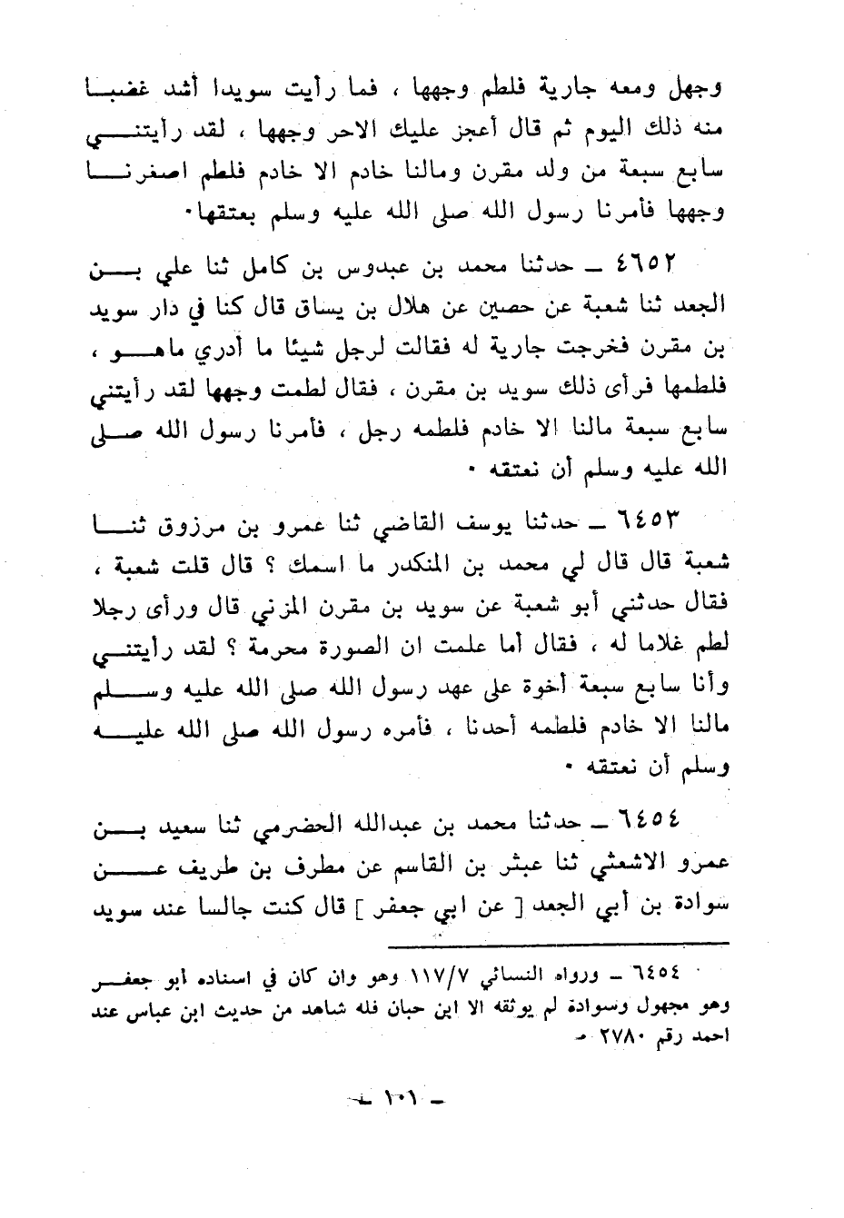 6495 - حَدَّثَنَا الْحَسَنُ بْنُ عَلِيٍّ الْفَسَوِيُّ، ثنا مُحَمَّدُ بْنُ عَبَّادِ بْنِ آدَمَ، ثنا مُعْتَمِرُ بْنُ سُلَيْمَانَ، قَالَ: سَمِعْتُ عِمْرَانَ يُحَدِّثُ , عَنْ خَالِدٍ الْأَشَجِّ، عَنْ سِنَانِ بْنِ سَلَمَةَ، أَنَّ النَّبِيَّ صَلَّى اللهُ عَلَيْهِ وَسَلَّمَ أَتَى عَلَى جَذَعَةٍ مَيْتَةٍ، فَقَالَ: «§مَا ضَرَّ أَهْلَ هَذِهِ لَوِ انْتَفَعُوا بِمَسْكِهَا»