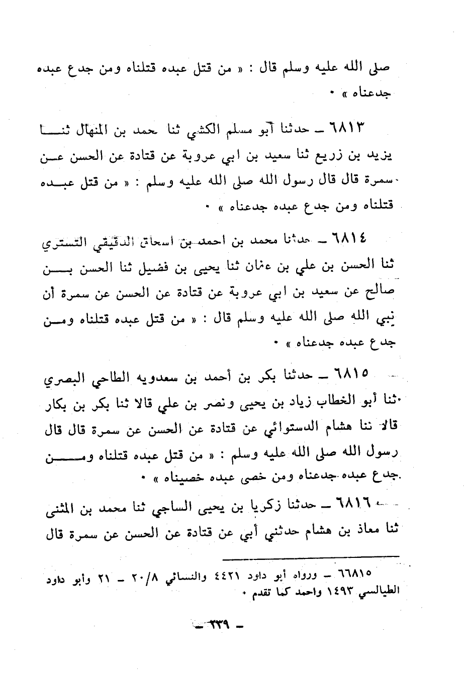 6985 - حَدَّثَنَا أَحْمَدُ بْنُ دَاوُدَ الْمَكِّيُّ، بِمِصْرَ، ثنا مُعَاوِيَةُ بْنُ عَطَاءٍ الْخُزَاعِيُّ، ثنا شُعْبَةُ، عَنْ عَوْفٍ، عَنْ أَبِي رَجَاءٍ الْعُطَارِدِيِّ، عَنْ سَمُرَةَ بْنِ جُنْدُبٍ، قَالَ: كَانَ رَسُولُ اللهِ صَلَّى اللهُ عَلَيْهِ وَسَلَّمَ كُلَّمَا أَصْبَحَ قَالَ لِأَصْحَابِهِ: «هَلْ رَأَى أَحَدٌ مِنْكُمْ رُؤْيَا؟» قَالَ: وَإِنَّهُ أَصْبَحَ ذَاتَ يَوْمٍ، فَقَالَ: " §إِنِّي رَأَيْتُ كَأَنَّ اثْنَيْنِ أَتَيَانِي، فَقَالَا: انْطَلِقِ انْطَلِقْ، فَانْطَلَقْتُ مَعَهُمَا , حَتَّى انْتَهَيَا بِي عَلَى شَيْخٍ أَبْيَضَ الرَّأْسِ وَاللِّحْيَةِ , كَئِيبٍ حَزِينٍ عِنْدَهُ نَارٌ وَهُوَ يَحُشُّهَا وَيُصْلِحُ مِنْهَا، فَقُلْتُ: بَارَكَ اللهُ فِيكُمَا , مَنْ هَذَا الشَّيْخُ؟ وَمَا هَذِهِ النَّارُ؟ فَقَالَا لِيَ: انْطَلِقِ انْطَلِقْ، فَانْطَلَقْتُ مَعَهُمَا , حَتَّى انْتَهَيَا بِي إِلَى رَجُلٍ، وَإِذَا رَجُلٌ قَائِمٌ عَلَى رَأْسَهِ وَإِذَا بِيَدِهِ كَلُّوبٌ مِنْ حَدِيدٍ , وَهُوَ يُشَرْشِرُ فَمَهُ إِلَى قَفَاهُ، وَمَنْخَرَهُ إِلَى قَفَاهُ وَعَيْنَهُ إِلَى قَفَاهُ، ثُمَّ يَفْعَلُ بِهَذِهِ النَّاحِيَةِ الْأُخْرَى، فَمَا يَفْرُغُ مِنْهَا حَتَّى تَعُودَ تِلْكَ النَّاحِيَةُ كَأَصَحِّ مَا كَانَتْ، فَقُلْتُ: يَا بَارَكَ اللهُ فِيكُمْ مَا هَذَانِ الرَّجُلَانِ؟ قَالَا لِيَ: انْطَلِقِ انْطَلِقْ، فَانْطَلَقْتُ مَعَهُمَا حَتَّى أَتَيَا بِي إِلَى رَجُلٍ مُسْتَلْقٍ عَلَى قَفَاهُ، وَإِذَا رَجُلٌ قَائِمٌ عَلَى رَأْسَهِ بِيَدِهِ صَخْرَةٌ، وَهُوَ يَثْلَغُ بِهَا رَأْسَهُ، فَيُدَهْدَهُ الْحَجَرُ مَكَانًا أَتَاكَ أَتَاكَ , فَيَذْهَبُ فَيَأْخُذُهُ، فَمَا يَرْجِعُ إِلَى صَاحِبِهِ حَتَّى يَرْجِعَ رَأْسُهُ كَأَصَحِّ مَا كَانَ , فَيَفْعَلُ نَحْوَ مَا فَعَلَ، فَقُلْتُ: يَا بَارَكَ اللهُ فِيكُمَا , مَا هَذَانِ؟ قَالَا: انْطَلِقِ انْطَلِقْ، فَانْطَلَقْتُ مَعَهُمَا، حَتَّى انْتَهَيَا بِي إِلَى شِبْهِ الْبِرْكَةِ، وَإِذَا فِيهَا رَجُلٌ يَسْبَحُ، وَإِذَا رَجُلٌ قَائِمٌ عَلَى شَفَةِ الْبِرْكَةِ بِيَدِهِ صَخْرَةٌ، فَيَجِيءُ السَّابِحُ فَيَفْغَرُ لَهُ فَاهُ، فَيُلْقِمُهُ ذَلِكَ الْحَجَرَ، فَقُلْتُ: يَا بَارَكَ اللهُ فِيكُمَا , مَا هَذَانِ؟ قَالَا لِيَ: انْطَلِقِ انْطَلِقْ، فَانْطَلَقْتُ مَعَهُمَا حَتَّى انْتَهَيَا بِي إِلَى -[240]- شِبْهِ التَّنُّورِ، وَإِذَا فِيهِ رِجَالٌ وَنِسَاءٌ , فَيَأْتِيهِمْ لَهَبٌ أَسْفَلَ مِنْهُمْ فَيُضَوْضِوُوا، فَقُلْتُ: يَا بَارَكَ اللهُ فِيكُمَا , مَا هَؤُلَاءِ؟ فَقَالَا لِيَ: انْطَلِقِ انْطَلِقْ، فَانْطَلَقْتُ مَعَهُمَا حَتَّى انْتَهَيَا بِي إِلَى أَرْضٍ بَيْضَاءَ كَأَنَّهَا الْفِضَّةُ، وَإِذَا فِيهَا كُلُّ نَوْرِ رَبِيعٍ، وَإِذَا رَجُلٌ أَبْيَضُ الرَّأْسِ وَاللِّحْيَةِ كَأَجْمَلِ مَا أَنْتَ رَاءٍ مِنَ الرِّجَالِ، وَإِذَا عِنْدَهُ وِلْدَانٌ فَهُوَ مُحَوِّشُهُمْ وَيُصْلِحُ مِنْهُمْ، فَقُلْتُ: يَا بَارَكَ اللهُ فِيكُمَا , مَنْ هَذَا الشَّيْخُ؟ وَمَنْ هَؤُلَاءِ الْوِلْدَانِ؟ قَالَا لِيَ: انْطَلِقِ انْطَلِقْ، فَانْطَلَقْتُ مَعَهُمَا حَتَّى انْتَهَيَا بِي إِلَى أَرْضٍ بَيْضَاءَ كَأَنَّهَا الْفِضَّةُ، وَإِذَا فِيهَا نَهَرٌ يَجْرِي، وَيَجِيءُ قَوْمٌ نِصْفُ أَجْسَادِهِمْ كَأَحْسَنِ مَا أَنْتَ رَاءٍ , وَنِصْفُ أَجْسَادِهِمْ كَأَقْبَحِ مَا أَنْتَ رَاءٍ، فَيَدْخُلُونَ فِي ذَلِكَ النَّهَرِ كَأَنَّمَا أُمِرُوا بِهِ، فَيَخْرُجُونَ مِنْهُ كَأَنَّمَا دُهِنُوا بِالدِّهَانِ، فَقُلْتُ: يَا بَارَكَ اللهُ فِيكُمَا , مَا هَؤُلَاءِ؟ قَالَا: انْطَلِقِ انْطَلِقْ، فَانْطَلَقْتُ مَعَهُمَا حَتَّى انْتَهَيَا بِي إِلَى سِدْرَةِ الْمُنْتَهَى، وَهِيَ جَنَّةُ عَدْنٍ، وَذَاكَ مَنْزِلُكُ، قُلْتُ: ي