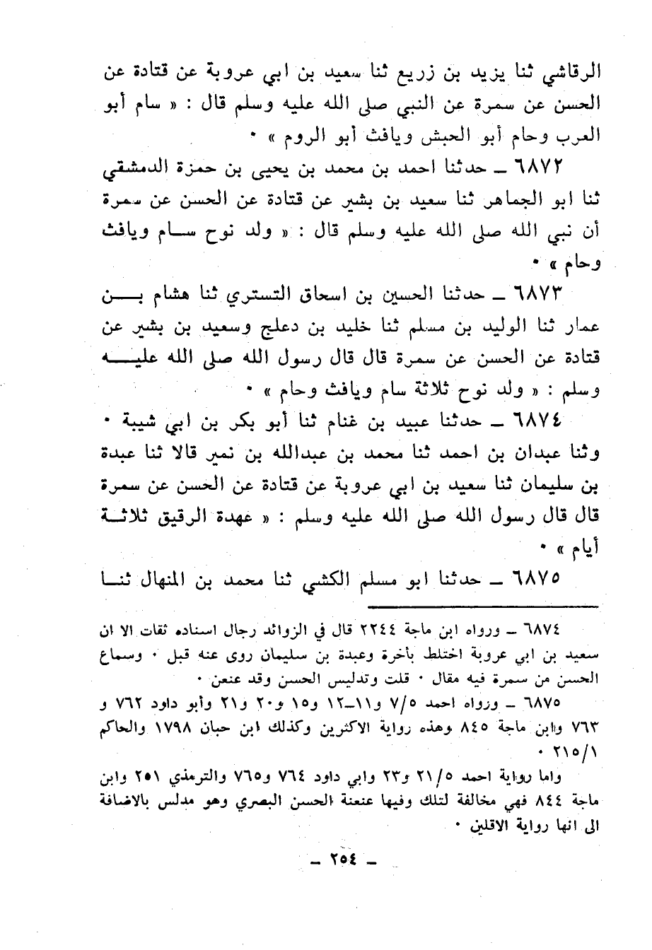 7033 - حَدَّثَنَا مُوسَى بْنُ هَارُونَ، ثنا مَرْوَانُ بْنُ جَعْفَرٍ، ثنا مُحَمَّدُ بْنُ إِبْرَاهِيمَ، ثنا جَعْفَرُ بْنُ سَعْدِ بْنِ سَمُرَةَ، عَنْ خُبَيْبِ بْنِ سُلَيْمَانَ، عَنْ أَبِيهِ، عَنْ سَمُرَةَ، أَنَّ رَسُولَ اللهِ صَلَّى اللهُ عَلَيْهِ وَسَلَّمَ قَالَ: «إِنَّ §الْعَرَبَ بَنُو سَامِ بْنِ نُوحٍ، وَإِنَّ الرُّومَ بَنُو يَافِثَ بْنِ نُوحٍ، وَإِنَّ الْحَبَشَةَ بَنُو حَامِ بْنِ نُوحٍ»