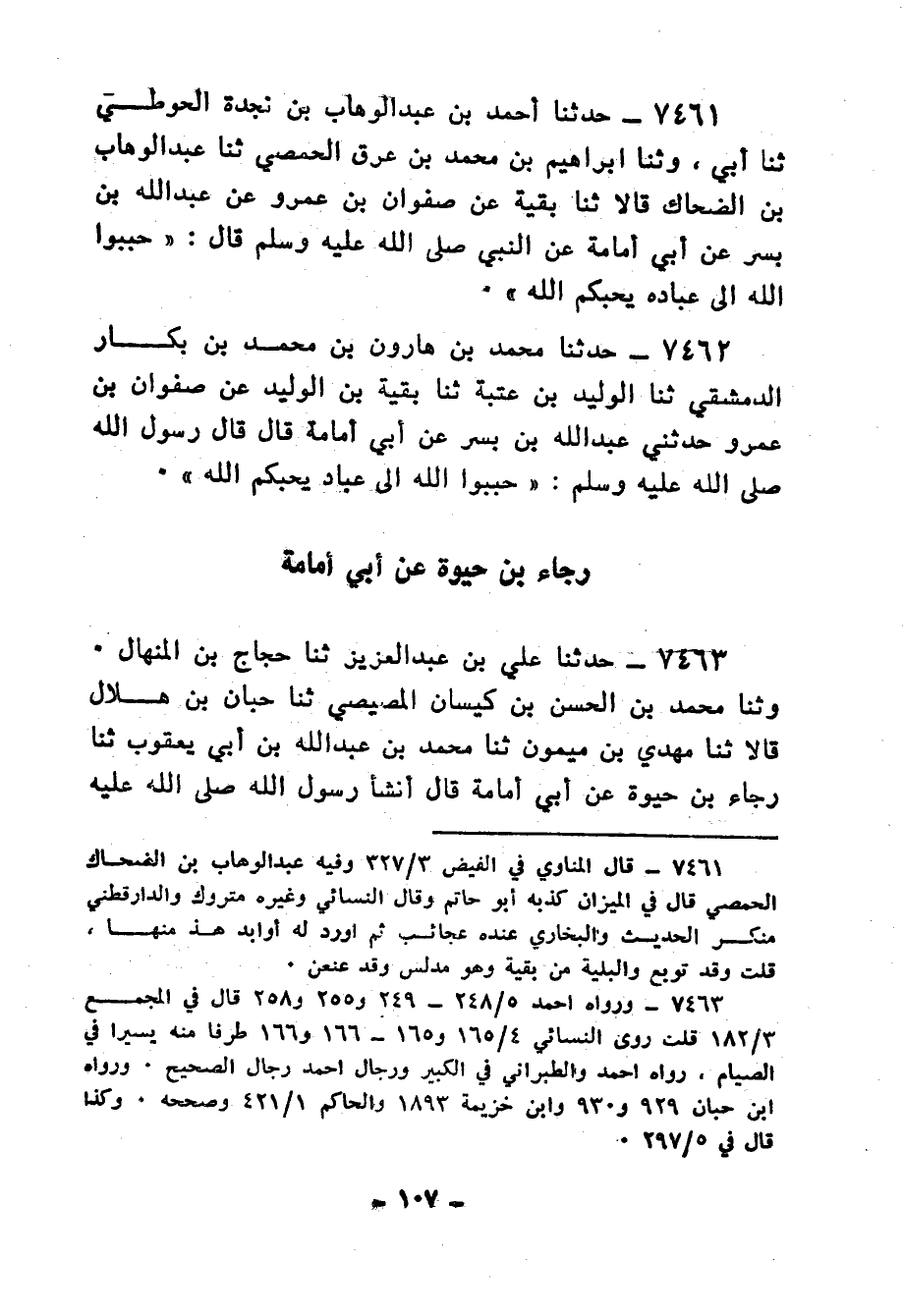 7512 - حَدَّثَنَا أَحْمَدُ بْنُ عَبْدِ الْوَهَّابِ بْنِ نَجْدَةَ الْحَوْطِيُّ، وأَحْمَدُ بْنُ مُحَمَّدِ بْنِ يَحْيَى بْنِ حَمْزَةَ الدِّمَشْقِيُّ قَالَا: ثنا يَحْيَى بْنُ صَالِحٍ الْوُحَاظِيُّ، ثنا جَمِيعُ بْنُ ثَوْبٍ الرَّحَبِيُّ، عَنْ حَبِيبِ بْنِ عُبَيْدٍ، عَنْ أَبِي أُمَامَةَ، قَالَ: قَالَ رَسُولُ اللهِ صَلَّى الله عَلَيْهِ وَسَلَّمْ: «§سَيَكُونُ رِجَالٌ مِنْ أُمَّتِي يَأْكُلُونَ أَلْوَانَ الطَّعَامِ، وَيَشْرَبُونَ أَلْوَانَ الشَّرَابِ، وَيُلْبِسُونَ أَلْوَانَ اللِّبَاسِ، وَيَتَشَدَّقُونَ فِي الْكَلَامِ، فَأُولَئِكَ شِرَارُ أُمَّتِي»