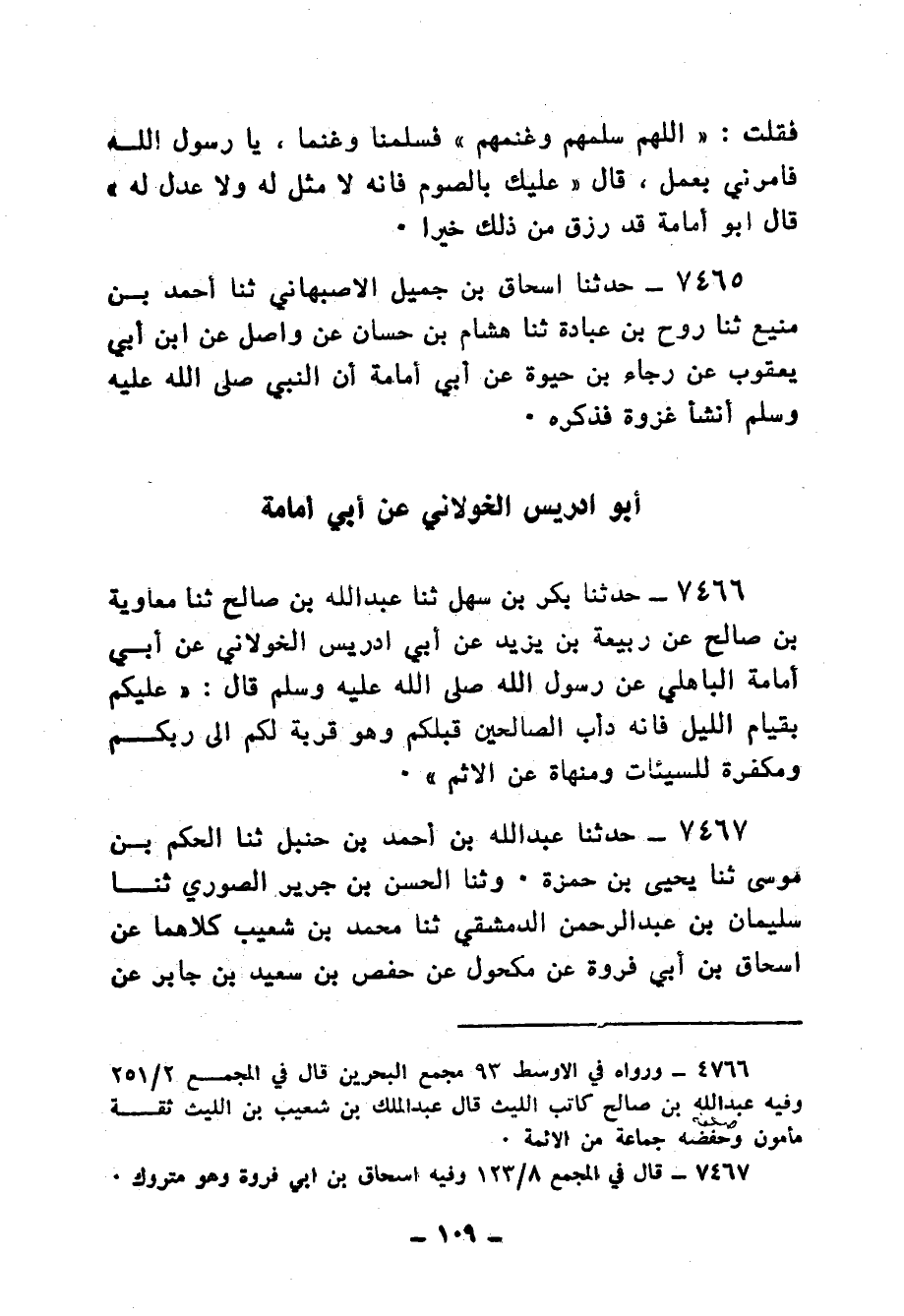 7518 - حَدَّثَنَا بَكْرُ بْنُ سَهْلٍ الدِّمْيَاطِيُّ، ثنا عَمْرُو بْنُ هَاشِمٍ الْبَيْرُوتِيُّ، ثنا إِدْرِيسُ بْنُ زِيَادٍ الْأَلْهَانِيُّ، عَنْ مُحَمَّدِ بْنِ زِيَادٍ الْأَلْهَانِيِّ، عَنْ أَبِي أُمَامَةَ الْبَاهِلِيِّ، أَنَّهُ كَانَ يُسَلِّمُ عَلَى كُلِّ مَنْ لَقِيَهُ. قَالَ: فَمَا عَلِمْتُ أَحَدًا سَبَقَهُ بِالسَّلَامِ إِلَّا يَهُودِيًّا مَرَّةً اخْتَبَأَ لَهُ خَلْفَ أُسْطُوَانَةٍ، فَخَرَجَ فَسَلَّمَ عَلَيْهِ، فَقَالَ لَهُ أَبُو أُمَامَةَ: وَيْحَكَ يَا يَهُودِيُّ، مَا حَمَلَكَ عَلَى مَا صَنَعْتَ؟ قَالَ: رَأَيْتُكَ رَجُلًا تُكْثِرُ السَّلَامَ، فَعَلِمْتُ أَنَّهُ فَضْلٌ، فَأَحْبَبْتُ أَنْ آخُذَ بِهِ، فَقَالَ أَبُو أُمَامَةَ: وَيْحَكَ، إِنِّي سَمِعْتُ رَسُولَ اللهِ صَلَّى الله عَلَيْهِ وَسَلَّمْ، يَقُولُ: «إِنَّ §اللهَ جَعَلَ السَّلَامَ تَحِيَّةً لِأُمَّتِنَا، وَأَمَانًا لِأَهْلِ ذِمَّتِنَا»