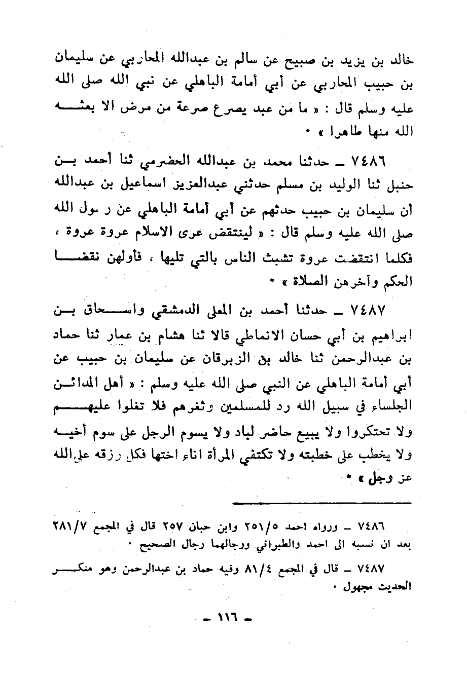7536 - حَدَّثَنَا إِبْرَاهِيمُ بْنُ مُحَمَّدِ بْنِ عِرْقٍ الْحِمْصِيُّ، ثنا مُحَمَّدُ بْنُ صَدَقَةَ الْجُبْلَانِيُّ، ثنا الْيَمَانُ بْنُ عَدِيٍّ، عَنْ مُحَمَّدِ بْنِ زِيَادٍ، عَنْ أَبِي أُمَامَةَ قَالَ: قَالَ النَّبِيُّ صَلَّى الله عَلَيْهِ وَسَلَّمْ: «§مَنْ جَرَّدَ ظَهْرَ امْرِئٍ مُسْلِمٍ بِغَيْرِ حَقٍّ، لَقِيَ اللهُ وَهُوَ عَلَيْهِ غَضْبَانُ»