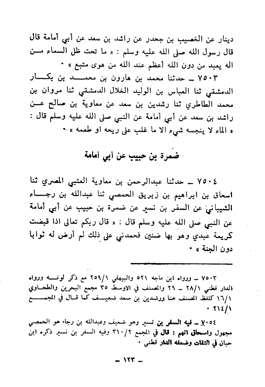 7562 - حَدَّثَنَا الْحُسَيْنُ بْنُ إِسْحَاقَ التُّسْتَرِيُّ، ثنا يَحيَى الْحِمَّانِيُّ، ثنا قَيْسُ بْنُ الرَّبِيعِ، عَنْ شِمْرِ بْنِ عَطِيَّةَ، عَنْ شَهْرِ بْنِ حَوْشَبٍ، عَنْ أَبِي أُمَامَةَ قَالَ: قَالَ رَسُولُ اللهِ صَلَّى الله عَلَيْهِ وَسَلَّمْ: «§مَنْ تَوَضَّأَ فَأَسْبَغَ الْوُضُوءَ خَرَجَتْ خَطَايَاهُ مِنْ سَمْعِهِ وَبَصَرِهِ وَيَدَيْهِ وَرِجْلَيْهِ»