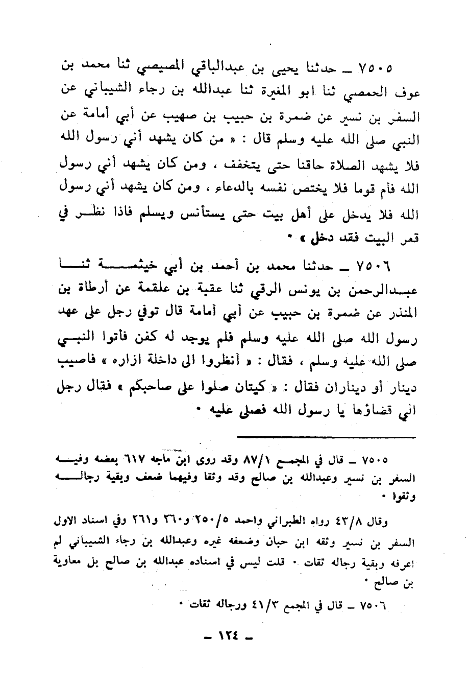 7565 - حَدَّثَنَا مُحَمَّدُ بْنُ النَّضْرِ الْأَزْدِيُّ، ثنا مُعَاوِيَةُ بْنُ عَمْرٍو، ثنا زَائِدَةُ، عَنْ عَاصِمٍ، عَنْ شَهْرِ بْنِ حَوْشَبٍ، عَنْ أَبِي أُمَامَةَ قَالَ: لَوْ لَمْ أَسْمَعْهُ مِنَ النَّبِيِّ صَلَّى الله عَلَيْهِ وَسَلَّمْ إِلَّا سَبْعَ مَرَّاتٍ مَا حَدَّثْتُ بِهِ، قَالَ: «§إِذَا تَوَضَّأَ الرَّجُلُ كَمَا أُمِرَ، ذَهَبَ الْإِثْمُ مِنْ سَمْعِهِ وَبَصَرِهِ وَيَدَيْهِ وَرِجْلَيْهِ»