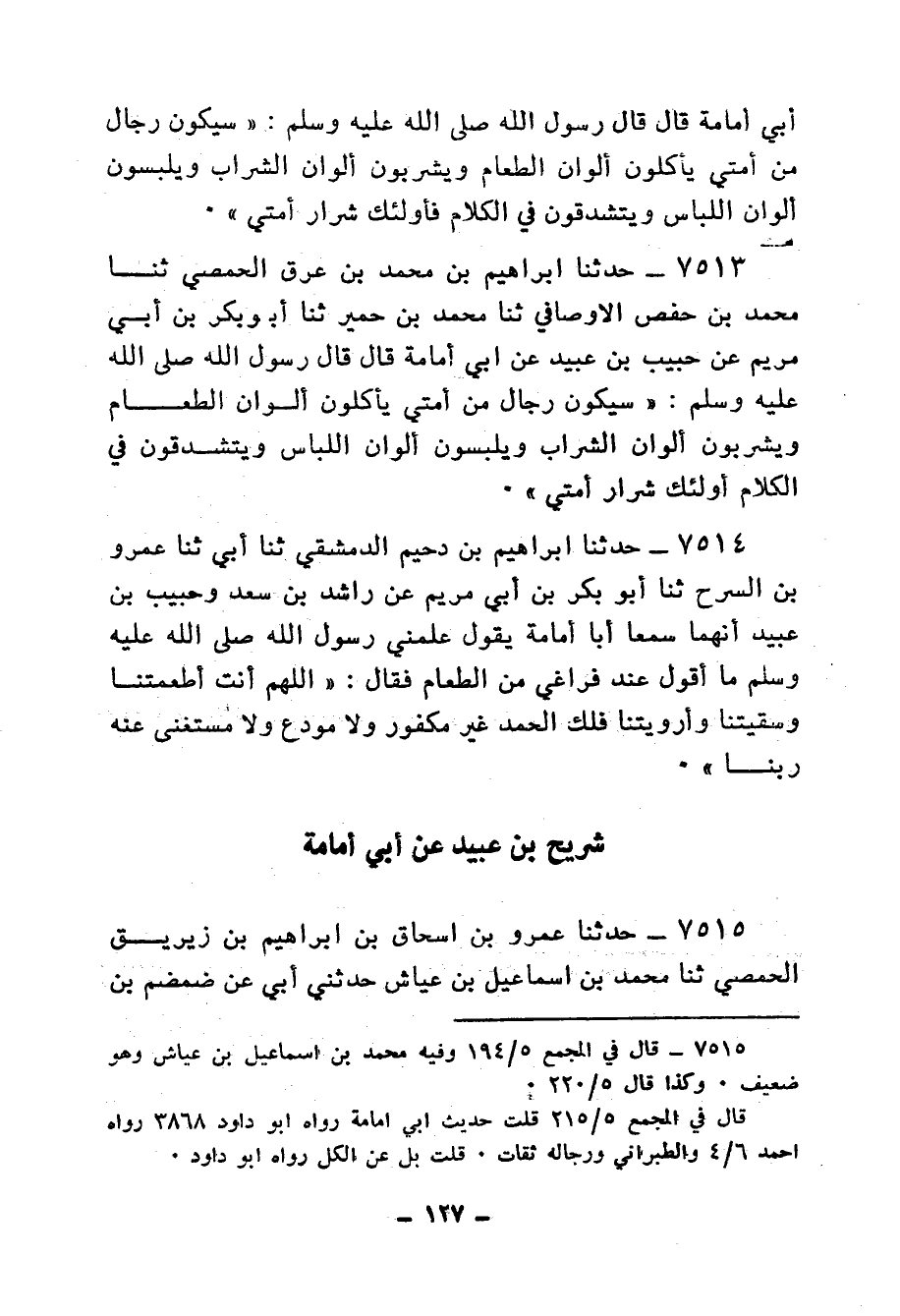 7578 - حَدَّثَنَا إِسْحَاقُ بْنُ خَالَوَيْهِ الْوَاسِطِيُّ، ثنا عَلِيُّ بْنُ بَحْرٍ، ثنا الْوَلِيدُ بْنُ مُسْلِمٍ، ثنا حَفْصُ بْنُ غَيْلَانَ، عَنْ مَكْحُولٍ، عَنْ أَبِي أُمَامَةَ عَنِ النَّبِيِّ صَلَّى الله عَلَيْهِ وَسَلَّمْ، قَالَ: «§مَنْ مَشَى إِلَى صَلَاةٍ مَكْتُوبَةٍ فِي الْجَمَاعَةِ، فَهِي كَحَجَّةٍ، وَمَنْ مَشَى إِلَى صَلَاةِ تَطَوُّعٍ فَهِي كَعُمْرَةٍ تَامَّةٍ»