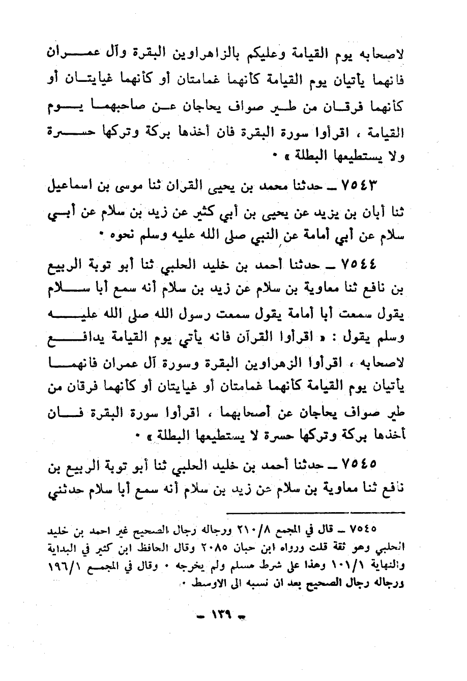 7627 - حَدَّثَنَا بَكْرُ بْنُ سَهْلٍ، ثنا عَبْدُ اللهِ بْنُ يُوسُفَ، حَدَّثَنِي يَحْيَى بْنُ حَمْزَةَ، ثنا الْأَوْزَاعِيُّ، أَنَّ شَدَّادًا أَبَا عَمَّارٍ، حَدَّثَهُ، ثنا أَبُو أُمَامَةَ، أَنَّهُ سَمِعَ رَسُولَ اللهِ صَلَّى الله عَلَيْهِ وَسَلَّمْ يَقُولُ: «§لَا يَلْبَسِ الْحَرِيرَ فِي الدُّنْيَا إِلَّا مَنْ لَا خَلَاقَ لَهُ»