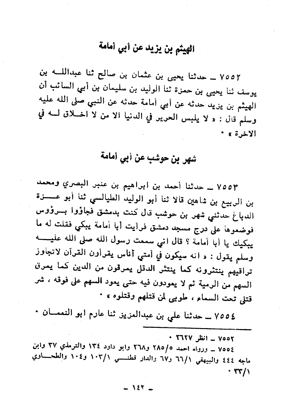 7633 - حَدَّثَنَا إِبْرَاهِيمُ بْنُ مُحَمَّدِ بْنِ عِرْقٍ الْحِمْصِيُّ، ثنا عَمْرُو بْنُ عُثْمَانَ، ثنا بَقِيَّةُ، عَنْ صَفْوَانَ بْنِ عَمْرٍو، عَنْ سَلَمَةَ الْقَيْسِيِّ، عَنْ أَبِي أُمَامَةَ، عَنِ النَّبِيِّ صَلَّى الله عَلَيْهِ وَسَلَّمْ، قَالَ: «§بَشِّرِ الْمُدْلِجِينَ إِلَى الْمَسَاجِدِ فِي الظُّلْمِ بِمَنَابِرَ مِنْ نُورٍ يَوْمَ الْقِيَامَةِ، يَفْزَعُ النَّاسُ وَلَا يَفْزَعُونَ»