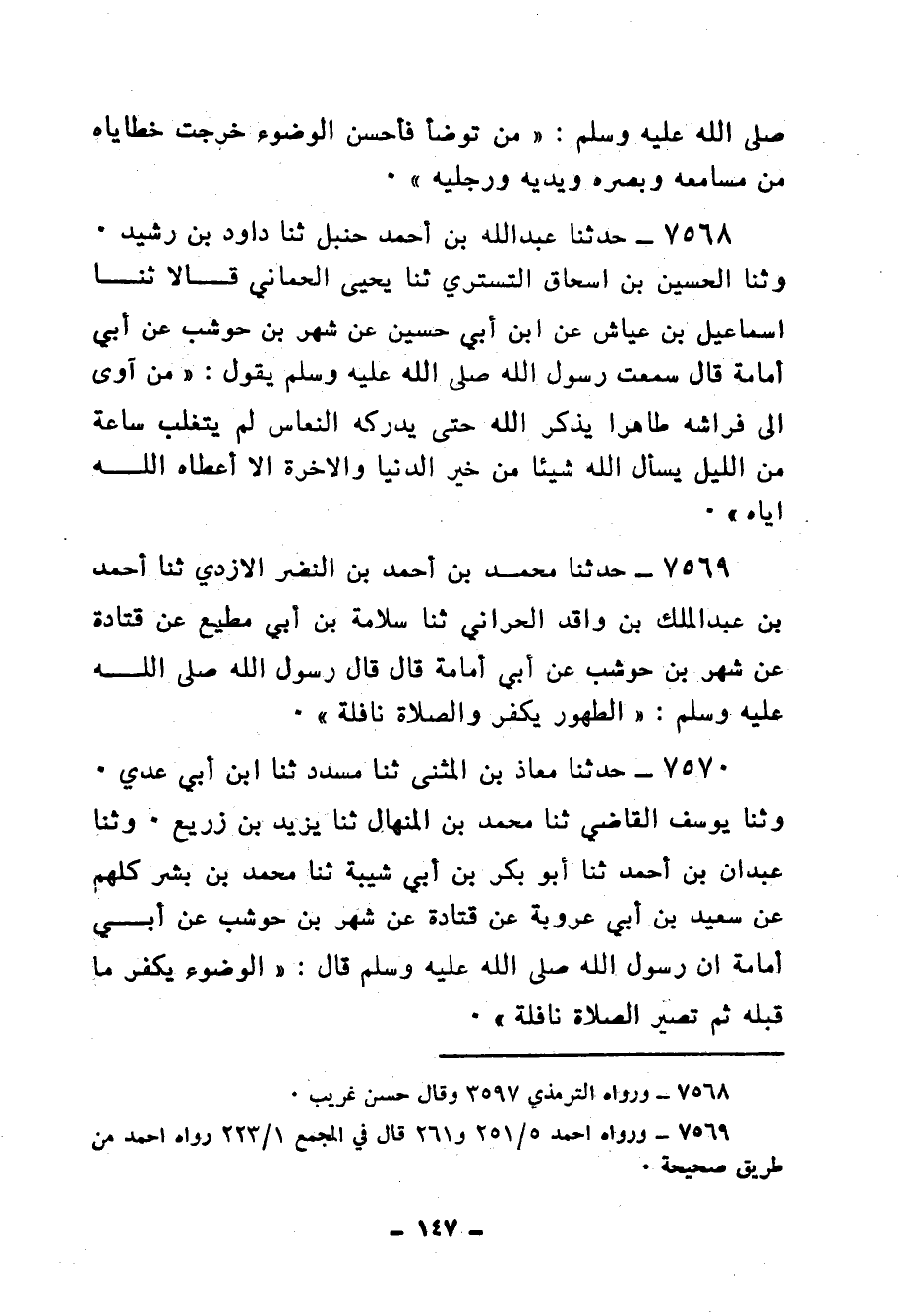 7646 - حَدَّثَنَا أَبُو عَبْدِ الْمَلِكِ أَحْمَدُ بْنُ إِبْرَاهِيمَ الدِّمَشْقِيُّ، ثنا سُلَيْمَانُ بْنُ عَبْدِ الرَّحْمَنِ بْنِ سَوَّارٍ الْهِلَالِيُّ، ثنا حُصَيْنُ بْنُ الْأَسْوَدِ الْهِلَالِيُّ، ثنا أَبُو أُمَامَةَ الْبَاهِلِيُّ، أَنَّ النَّبِيَّ صَلَّى الله عَلَيْهِ وَسَلَّمْ كَانَ يَقُولُ لِأَصْحَابِهِ: «§إِذَا كَانَ أَحَدُكُمْ عَلَى وُضُوءٍ، فَأَكَلَ طَعَامًا يَتَوَضَّأُ إِلَّا أَنْ يَكُونَ لَبَنَ الْإِبِلِ إِذَا شَرِبْتُمُوهُ فَتَمَضْمِضُوا بِالْمَاءِ»