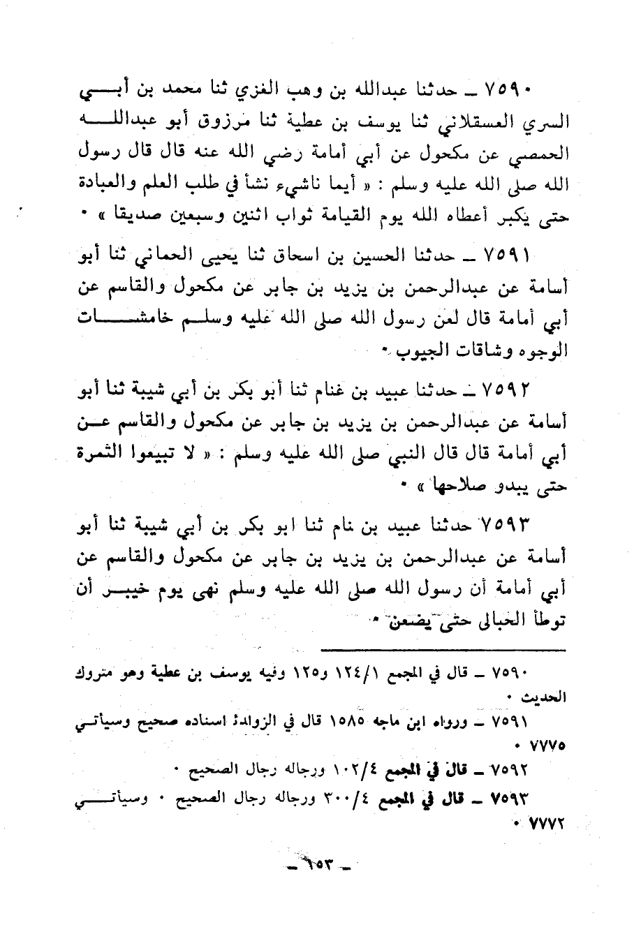 7660 - حَدَّثَنَا مُحَمَّدُ بْنُ جَعْفَرِ بْنِ سُفْيَانَ الرَّقِّيُّ، ثنا عَلِيُّ بْنُ مَيْمُونٍ الرَّقِّيُّ، ثنا عَبْدُ اللهِ بْنُ خَالِدٍ الْقُرْقُسَانِيُّ عَبْدُونَ، عَنْ عَبْدِ اللهِ بْنِ يَزِيدَ الْأَوْدِيِّ، عَنْ أَبِي الدَّرْدَاءِ، ووَاثِلَةَ بْنِ الْأَسْقَعِ، وأَبِي أُمَامَةَ، وأَنَسِ بْنِ مَالِكٍ قَالُوا: كُنَّا فِي مَجْلِسٍ فِيهِ نَاسٌ مِنَ الْيَهُودِ، وَنَحْنُ نَتَذَاكَرُ الْقَدَرَ، فَخَرَجَ عَلَيْنَا النَّبِيُّ صَلَّى الله عَلَيْهِ وَسَلَّمْ مُغْضَبًا، فَعَبَسَ، وَقَطَبَ، وَانْتَهَرَ، ثُمَّ قَالَ: «مَهْ مَهِ، §اتَّقُوا اللهَ يَا أُمَّةَ مُحَمَّدٍ، وَادِيَانِ عَمِيقَانِ قَعْرَانِ مُظْلِمَانِ، لَا تَهْتَجُوا عَلَيْكُمْ وَهَجَ النَّارِ» ، ثُمَّ أَمَرَ الْيَهُودَ أَنْ يَقُومُوا، ثُمَّ قَالَ وَبَسَطَ يَمِينَهُ، وَبَسَطَ إِصْبَعَهُ الشِّمَالَ