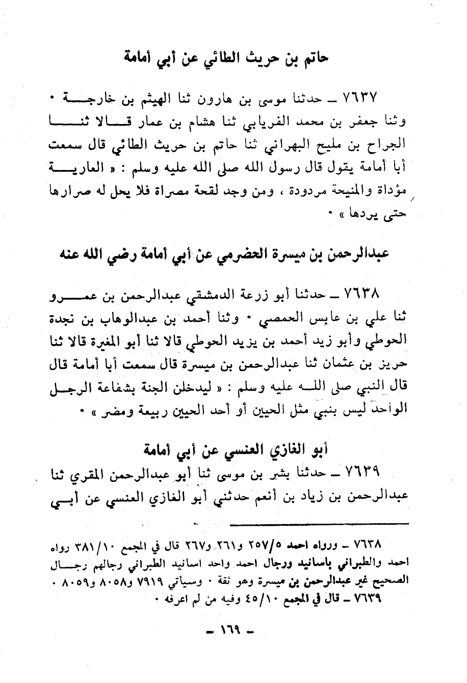 7710 - حَدَّثَنَا أَحْمَدُ بْنُ عَبْدِ الرَّحْمَنِ بْنِ عِقَالٍ الْحَرَّانِيُّ، ثنا أَبُو جَعْفَرٍ النُّفَيْلِيُّ، حَدَّثَنَا عُفَيْرُ بْنُ مَعْدَانَ، عَنْ سُلَيْمِ بْنِ عَامِرٍ، عَنْ أَبِي أُمَامَةَ رَضِيَ اللهُ عَنْهُ «أَنَّ رَسُولَ اللهِ اللهِ صَلَّى الله عَلَيْهِ وَسَلَّمْ §مَسَحَ عَلَى الْخُفَّيْنِ، وَالْعِمَامَةِ فِي غَزْوَةِ تَبُوكَ»