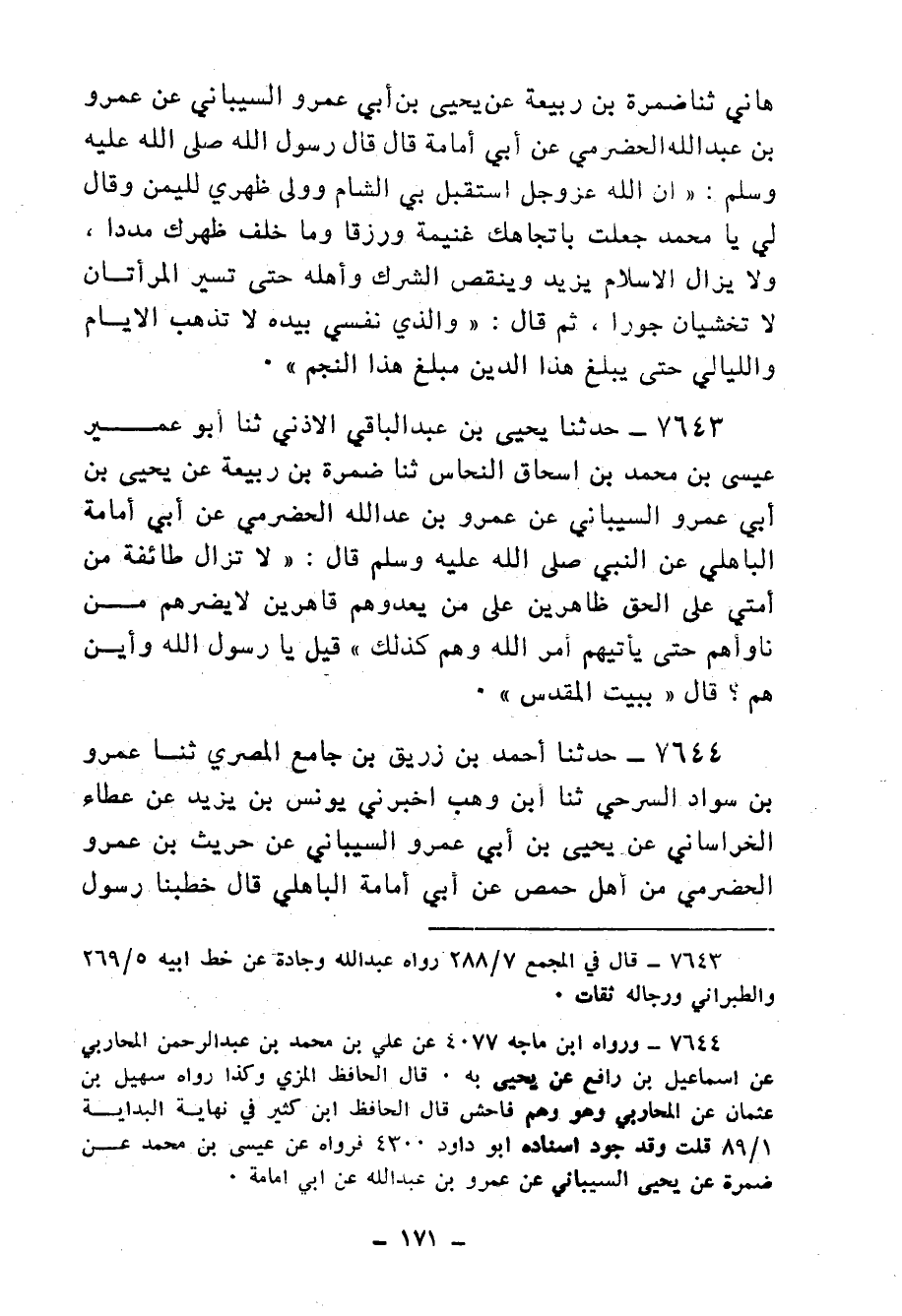 7717 - حَدَّثَنَا إِبْرَاهِيمُ بْنُ دُحَيْمٍ، ثنا أَبِي ح، وحَدَّثَنَا أَحْمَدُ بْنُ الْمُعَلَّى الدِّمَشْقِيُّ، ثنا هِشَامُ بْنُ عَمَّارٍ، قَالَا: ثنا الْوَلِيدُ بْنُ مُسْلِمٍ، عَنْ عُفَيْرِ بْنِ مَعْدَانَ، عَنْ سُلَيْمِ بْنِ عَامِرٍ، عَنْ أَبِي أُمَامَةَ قَالَ: قَالَ رَسُولُ اللهِ صَلَّى الله عَلَيْهِ وَسَلَّمْ: " §أُنْزِلَ الْقُرْآنُ فِي ثَلَاثَةِ أَمْكِنَةٍ: بِمَكَّةَ، وَالْمَدِينَةِ، وَالشَّامِ "