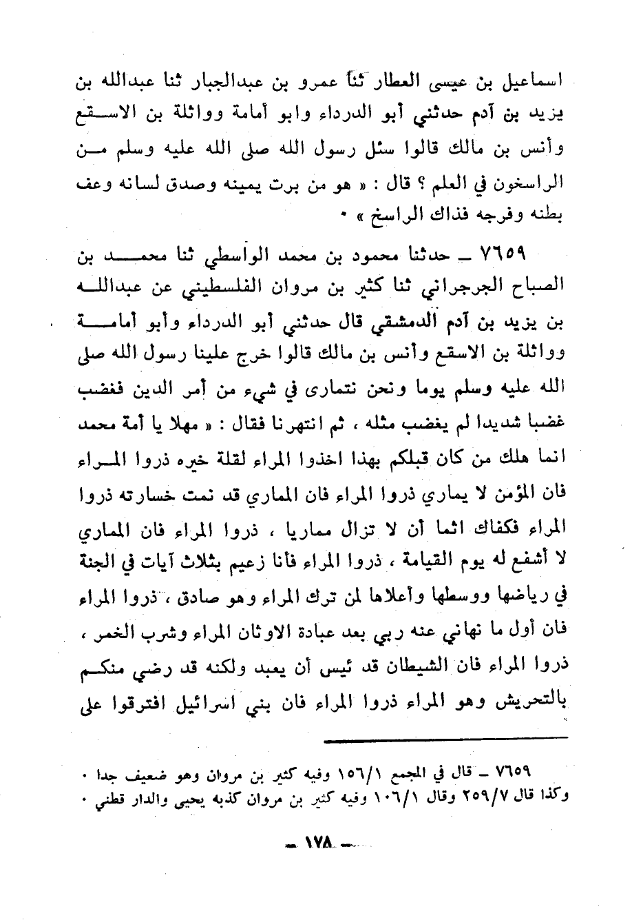 7742 - حَدَّثَنَا الْحُسَيْنُ بْنُ السَّمَيْدَعِ الْأَنْطَاكِيُّ، ثنا مُوسَى بْنُ أَيُّوبَ النَّصِيبِيُّ، ح وحَدَّثَنَا أَحْمَدُ بْنُ النَّضْرِ الْعَسْكَرِيُّ، ثنا سُلَيْمَانُ بْنُ سَلَمَةَ الْخَبَائِرِيُّ، ثنا بَقِيَّةُ بْنُ الْوَلِيدِ، عَنْ إِسْحَاقَ بْنِ مَالِكٍ الْحَضْرَمِيِّ، عَنْ يَحْيَى بْنِ الْحَارِثِ، عَنِ الْقَاسِمِ، عَنْ أَبِي أُمَامَةَ قَالَ: قَالَ رَسُولُ اللهِ صَلَّى الله عَلَيْهِ وَسَلَّمْ: «§إِنَّ الَّذِي يَجْهَرُ بِالْقُرْآنِ كَالَّذِي يَجْهَرُ بِالصَّدَقَةِ، وَالَّذِي يُسِرُّ بِالْقُرْآنِ كَالَّذِي يُسِرُّ بِالصَّدَقَةِ»