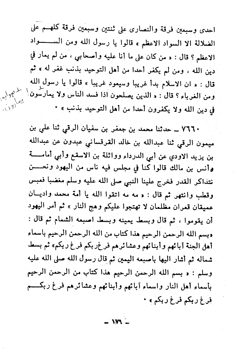 7747 - حَدَّثَنَا إِبْرَاهِيمُ بْنُ دُحَيْمٍ، ثنا أَبِي ح، وحَدَّثَنَا عَبْدَانُ بْنُ أَحْمَدَ، ثنا دُحَيْمٌ، ح وحَدَّثَنَا يَحْيَى بْنُ عَبْدِ الْبَاقِي الْمِصِّيصِيُّ، ثنا عَمْرُو بْنُ عُثْمَانَ الْحِمْصِيُّ، قَالُوا: ثنا الْوَلِيدُ بْنُ مُسْلِمٍ، حَدَّثَنِي يَحْيَى بْنُ الْحَارِثِ، عَنِ الْقَاسِمِ، عَنْ أَبِي أُمَامَةَ، عَنِ النَّبِيِّ صَلَّى الله عَلَيْهِ وَسَلَّمْ قَالَ: «§مَنْ لَمْ يَغْزُ، أَوْ يُجَهِّزْ غَازِيًا، أَوْ يَخْلُفْ غَازِيًا فِي أَهْلِهِ أَصَابَهُ اللهُ بِقَارِعَةِ يَوْمِ الْقِيَامَةِ»