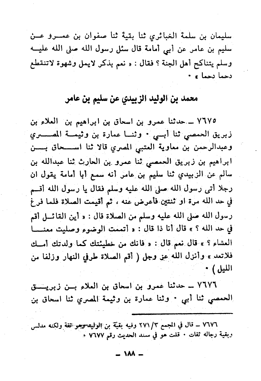 7777 - حَدَّثَنَا الْحُسَيْنُ بْنُ إِسْحَاقَ التُّسْتَرِيُّ، وَعَبْدَانُ بْنُ أَحْمَدَ، وَمُوسَى بْنُ سَهْلٍ أَبُو عِمْرَانَ الْجَوْنِيُّ، قَالُوا: ثنا هِشَامُ بْنُ عَمَّارٍ، ثنا عَبْدُ الْمَلِكِ بْنُ مُحَمَّدٍ الصَّنْعَانِيُّ، ثنا ابْنُ جَابِرٍ، عَنِ الْقَاسِمِ، عَنْ أَبِي أُمَامَةَ، عَنِ النَّبِيِّ صَلَّى اللهُ عَلَيْهِ وَسَلَّمَ، قَالَ: «إِنَّ §اللهَ عَزَّ وَجَلَّ لَمْ يُحِلَّ فِي الْفِتْنَةِ شَيْئًا حَرَّمَهُ قَبْلَ ذَلِكَ، مَا بَالُ أَحَدِكُمْ يَأْتِي أَخَاهُ فَيُسَلِّمُ عَلَيْهِ، ثُمَّ يَأْتِي بَعْدَ ذَلِكَ فَيَقْتُلُهُ»
