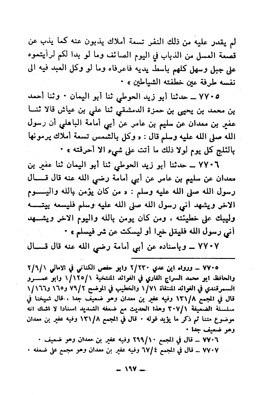 7804 - حَدَّثَنَا مُحَمَّدُ بْنُ الْعَبَّاسِ الْمُؤَدِّبُ الْبَغْدَادِيُّ، ثنا دَاوُدُ بْنُ مِهْرَانَ الدَّبَّاغُ، ثنا الْمُشْمَعَلُّ بْنُ مِلْحَانَ، عَنْ مُطَّرِحِ بْنِ يَزِيدَ، عَنْ عُبَيْدِ اللهِ بْنِ زَحْرٍ، عَنْ عَلِيِّ بْنِ يَزِيدَ، عَنِ الْقَاسِمِ، عَنْ أَبِي أُمَامَةَ رَضِيَ اللهُ عَنْهُ، قَالَ: قَالَ رَسُولُ اللهِ صَلَّى اللهُ عَلَيْهِ وَسَلَّمَ: «§بَعَثَنِي اللهُ هُدًى وَرَحْمَةً لِلْعَالَمِينَ، وَأَمَرَنِي رَبِّي أَنْ أَدُقَّ الْمَزَامِيرَ، وَالْمَعَازِفَ، وَالْأَوْثَانَ الَّتِي كَانَتْ تُعْبَدُ مِنْ دُونِ اللهِ، وَأَقْسَمَ رَبِّي بِعِزَّتِهِ لَا يَشْرَبُ الْخَمْرَ عَبْدٌ مِنْ عَبِيدِي إِلَّا سَقَيْتُهُ إِيَّاهُ مِنَ الْحَمِيمِ، فَإِمَّا أَغْفِرُ لَهُ، وَإِمَّا أُعَذِّبُهُ، وَأَقْسَمَ رَبِّي بِعِزَّتِهِ لَا يَسْقِي عَبْدٌ مِنْ عَبِيدِي صَبِيًّا لَا يَعْقِلُهُ إِلَّا سَقَيْتُهُ مِثْلَ مَا سَقَاهُ مِنَ الْحَمِيمِ، إِمَّا أَنْ أَغْفِرَ لَهُ، وَإِمَّا أَنْ أُعَذِّبَهُ، وَأَقْسَمَ رَبِّي بِعِزَّتِهِ لَا يَتْرُكُهُ عَبْدٌ مِنْ عَبِيدِي مَخَافَتِي إِلَّا سَقَيْتُهُ إِيَّاهُ فِي حَضِيرَةِ الْقُدُسِ»