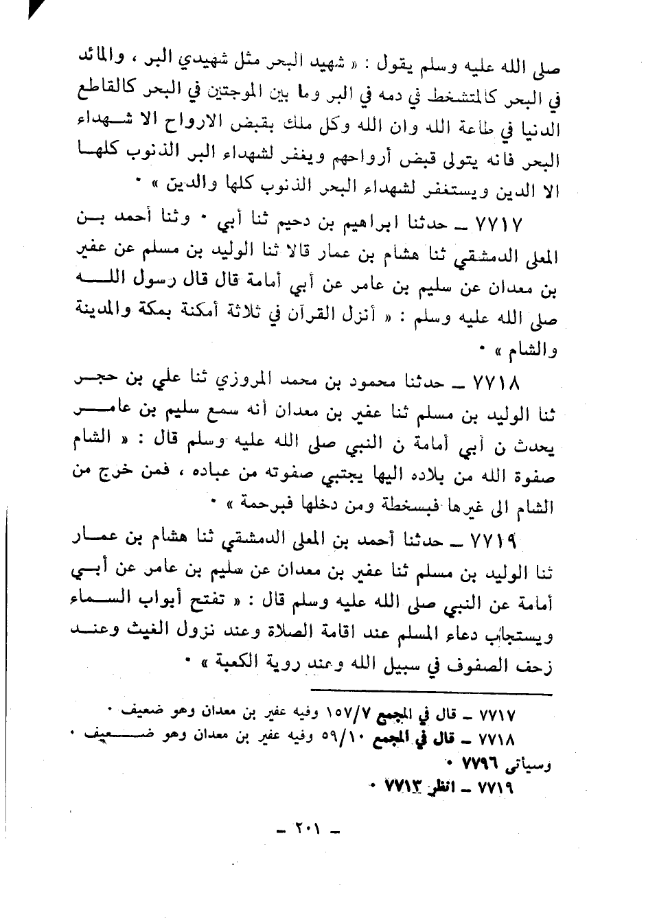 7818 - حَدَّثَنَا الْحَسَنُ بْنُ عَلِيِّ بْنِ خَلَفٍ الدِّمَشْقِيُّ، ثنا سُلَيْمَانُ بْنُ عَبْدِ الرَّحْمَنِ، ثنا إِسْمَاعِيلُ بْنُ عَيَّاشٍ، عَنْ مُطَّرِحِ بْنِ يَزِيدَ، عَنْ عُبَيْدِ اللهِ بْنِ زَحْرٍ، عَنْ عَلِيِّ بْنِ يَزِيدَ، عَنِ الْقَاسِمِ، عَنْ أَبِي أُمَامَةَ، عَنْ رَسُولِ اللهِ صَلَّى اللهُ عَلَيْهِ وَسَلَّمَ قَالَ: «§النَّائِحَةُ يَوْمَ الْقِيَامَةِ عَلَى طَرِيقٍ بَيْنَ الْجَنَّةِ وَالنَّارِ، سَرَابِيلُهَا مِنْ قَطِرَانٍ، وَتَغْشَى وَجْهَهَا النَّارُ، إِذَا لَمْ تَتُبْ»