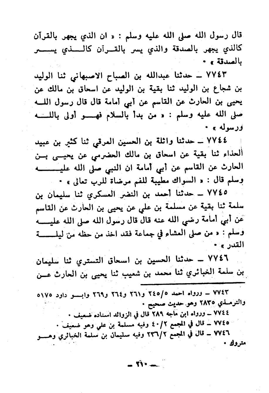 7847 - حَدَّثَنَا يَحْيَى بْنُ أَيُّوبَ، ثنا سَعِيدُ بْنُ أَبِي مَرْيَمَ، أنا يَحْيَى بْنُ أَيُّوبَ، عَنْ عُبَيْدِ اللهِ بْنِ زَحْرٍ، عَنْ عَلِيِّ بْنِ يَزِيدَ، عَنِ الْقَاسِمِ، عَنْ أَبِي أُمَامَةَ، عَنْ رَسُولِ اللهِ صَلَّى اللهُ عَلَيْهِ وَسَلَّمَ قَالَ: «§مَا جَاءَنِي جِبْرِيلُ قَطُّ إِلَّا أَمَرَنِي بِالسِّوَاكِ حَتَّى لَقَدْ خَشِيتُ أَنْ أُحْفِيَ مُقَدَّمَ فَمِي»